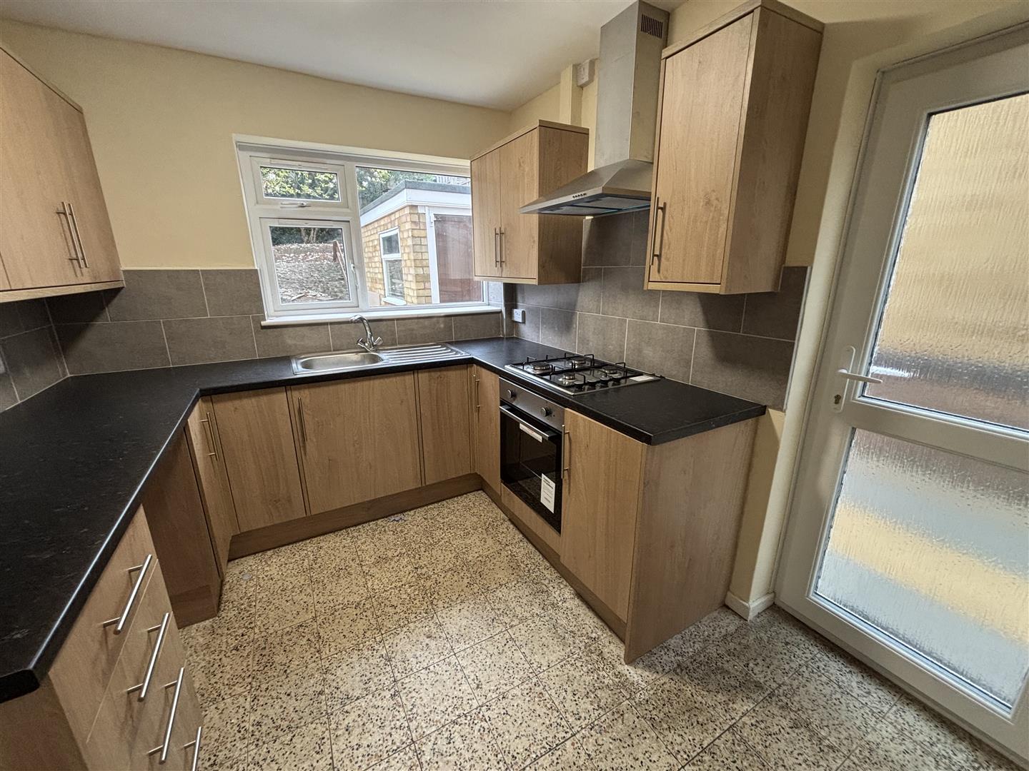 Kitchen - 3.86m x 2.46m (12'8 x 8'1) - A brand new refitted modern kitchen. UPVC double glazed window to rear, tiled flooring, UPVC double glazed single door to side. Fitted with a range of modern base, drawer & eye level units, work surfaces, tiled splashback. Built-in stainless steel electric oven, gas hob with extractor hood. Pantry store with UPVC double glazed window.