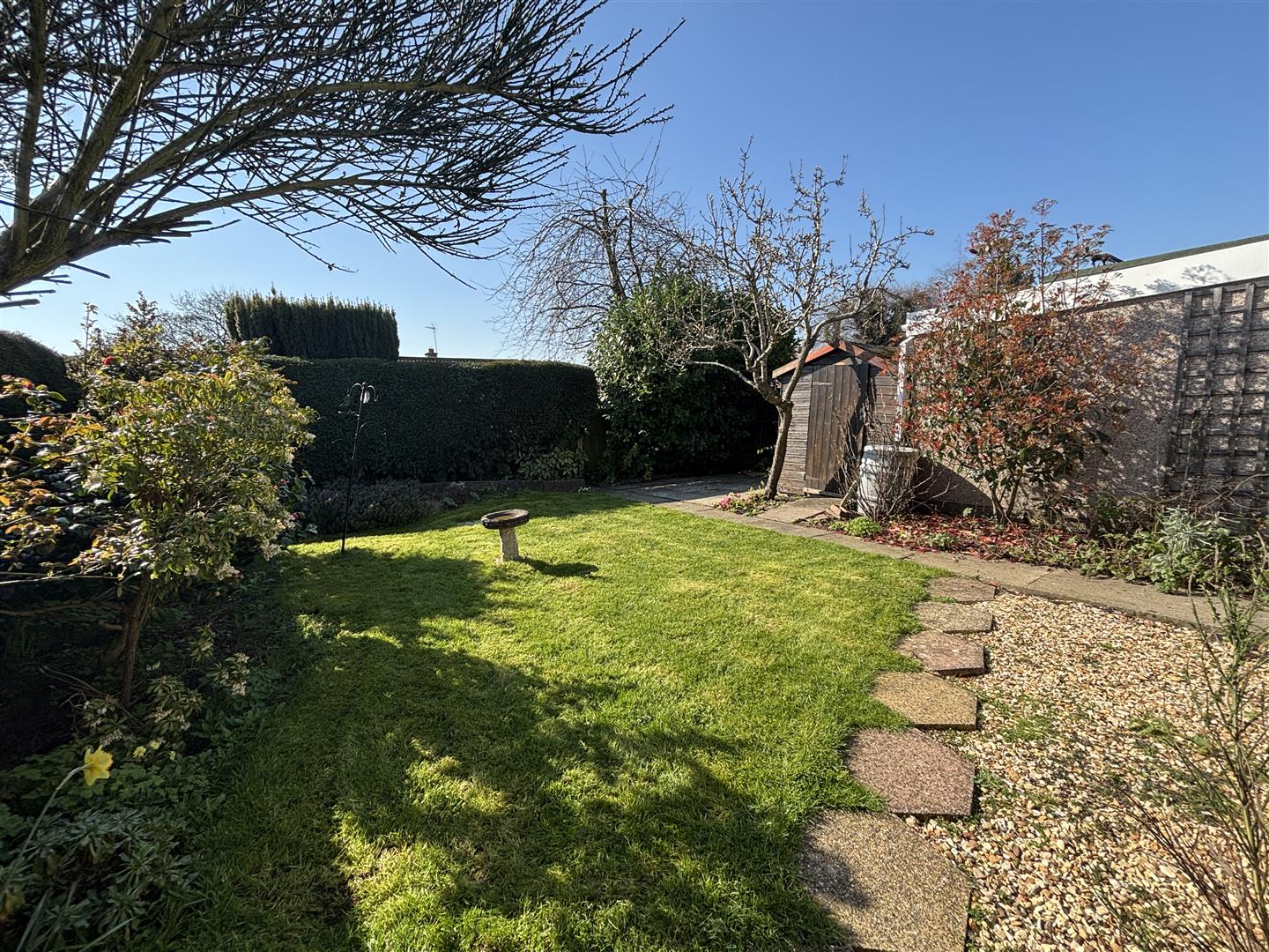 The rear garden has patio, lawn, shrubs, trees, shed, fully fenced hedges.