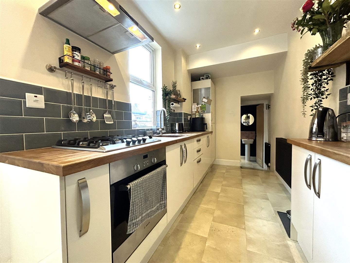 Kitchen - 4.57m x 1.83m (15'17 x 6'33) - Fitted with a range of floor and wall mounted units, solid wood worktop and tiled splashbacks. The kitchen also benefits from a breakfast bar, gas hob, electric oven and extractor fan, sink and drainer unit, fitted fridge freezer, spotlights, uPVC double glazed window to the side aspect and a uPVC double glazed door leading to the side of the property.