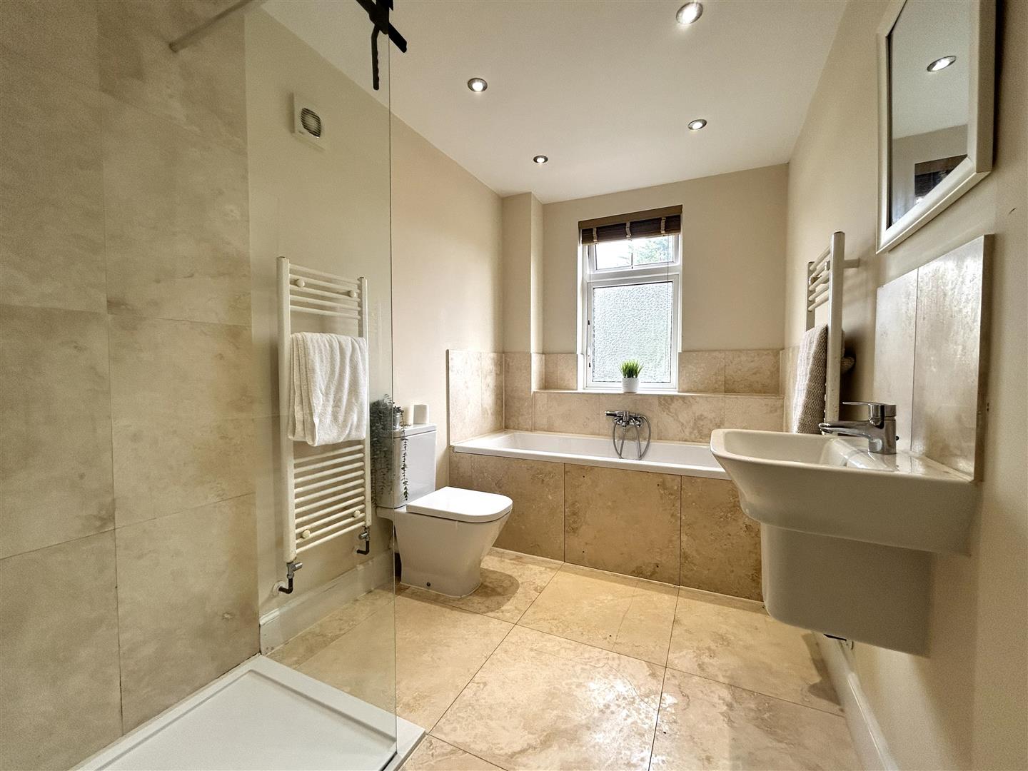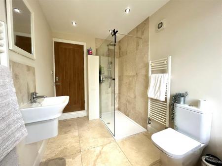 Family Bathroom - 3.66m x 1.83m (12 x 6'33) - Fitted with a four piece suite comprising; walk in shower, bath, wall hung basin and wc. The bathroom also benefits from two heated towel rails, spotlights, extractor fan and an obscure uPVC double glazed window to the rear aspect.