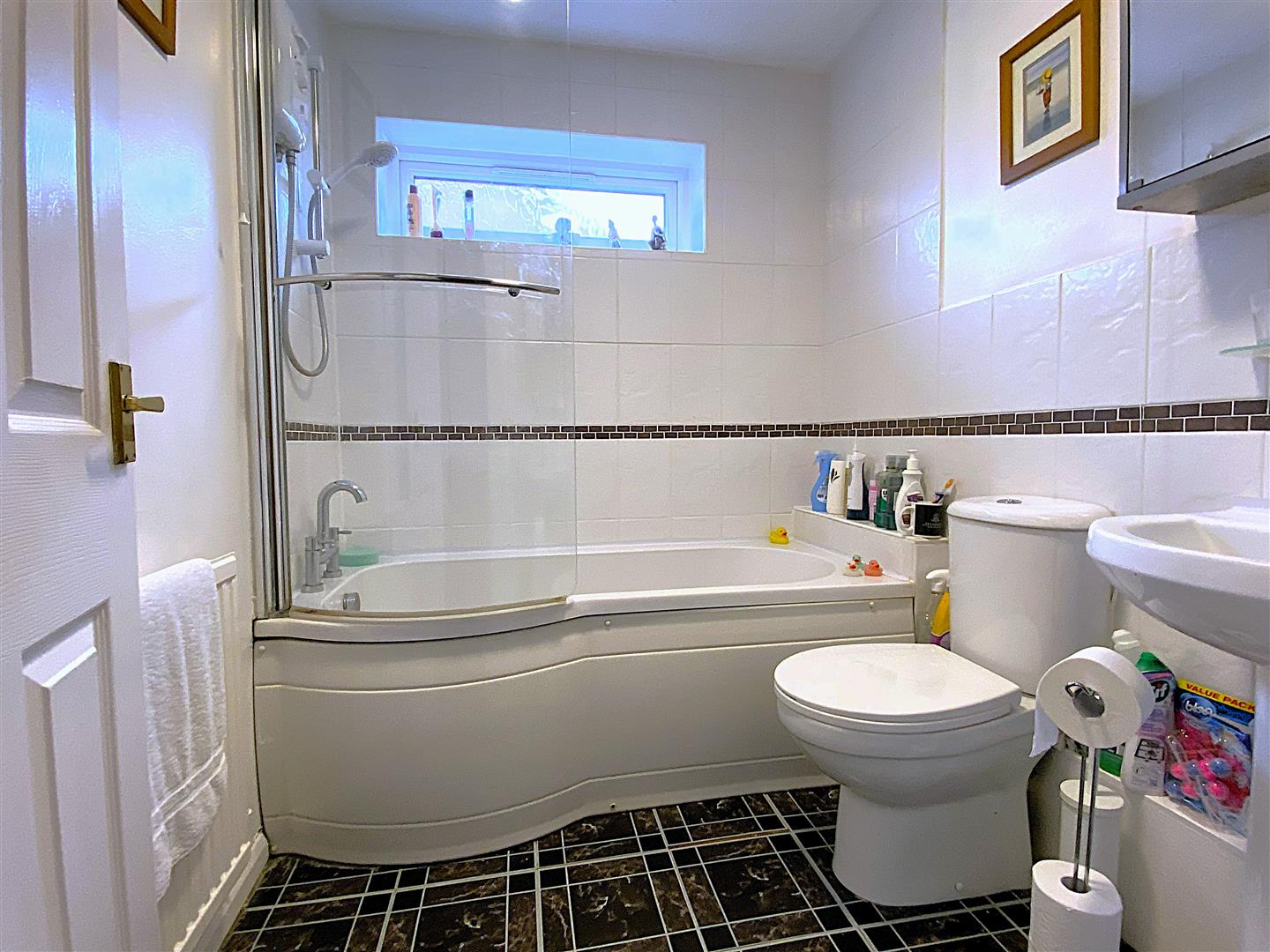 Bathroom - 2.11 x 1.79 (6'11" x 5'10" ) - Fitted with a three piece suite comprising, low level wc, pedestal basin and bath with shower over.