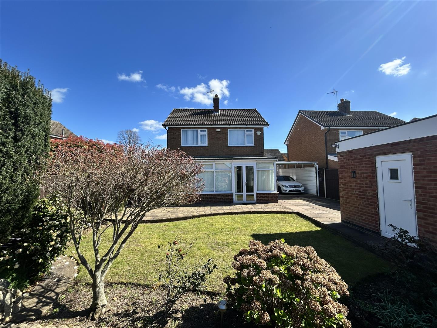 To the rear is a well maintained lawn garden with paved patio areas.