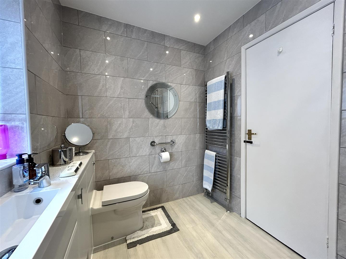 Shower Room - 2.67m x 1.83m (8'09 x 6) - Fitted with a modern three piece suite comprising walk in shower and vanity unit with wc and basin. The tiled shower room also benefits from a heated towel rail, spotlights, extractor fan and an obscure uPVC double glazed window to the side aspect.