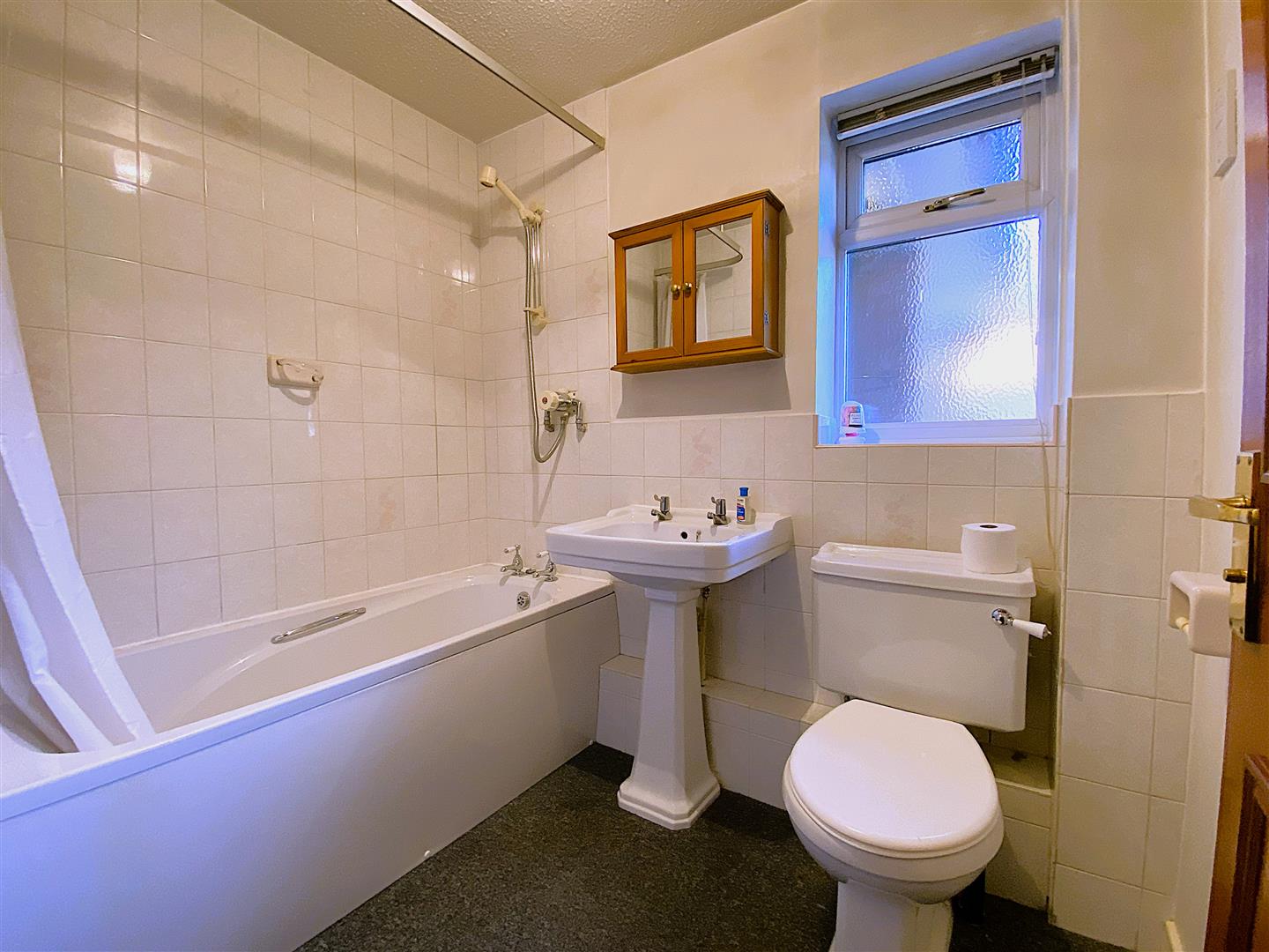 Bathroom - 1.68 x 2.23 (5'6" x 7'3") - Fitted with a three piece suite comprising, low level wc, pedestal basin and bath.