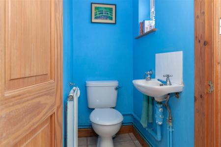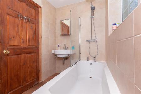 Bathroom - 1.63 x 2.43 (5'4" x 7'11") - Fitted with a three piece suite comprising bath with shower over, pedestal basin and wc. The tiled bathroom also benefits from a heated towel rail, extractor fan and an obscure uPVC double glazed window to the side aspect.