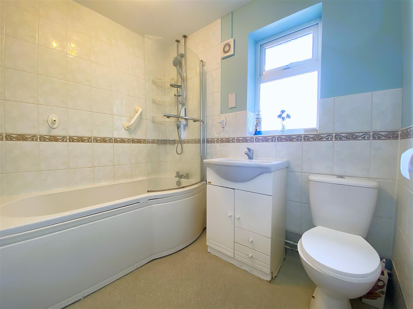 Bathroom - 1.89 x 2.28 (6'2" x 7'5" ) - Fitted with a three piece suite comprising, low level wc, vanity unit with mounted basin and bath with shower over.