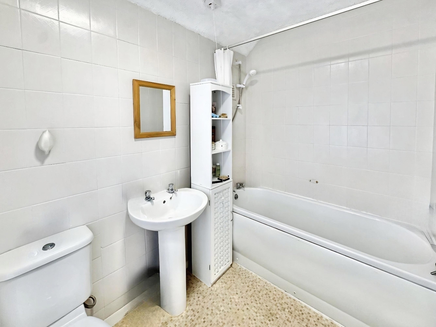 Upstairs, the property comprises two well-proportioned double bedrooms, a single bedroom, and a family bathroom fitted with a bath and overhead shower, WC, and wash hand basin.