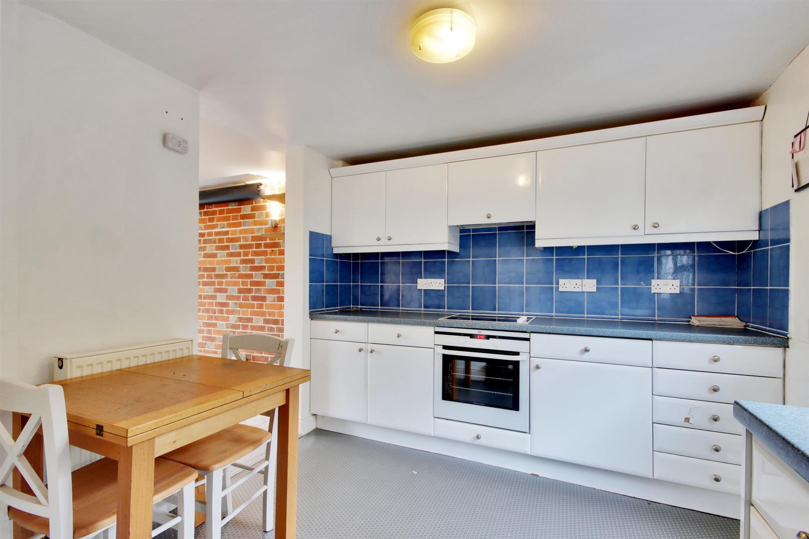 .Kitchen/breakfast room fitted with a range of white gloss wall mounted cabinets and base units comprising one and a half bowl single drainer stainless steel sink unit, inset electric AEG ceramic hob with AEG extractor hood above and matching single oven below, tiled splashbacks to work surfaces, understairs cupboard with latch door, central heating programmer, oak breakfast table (to remain if required) and stable door leading to the garden.