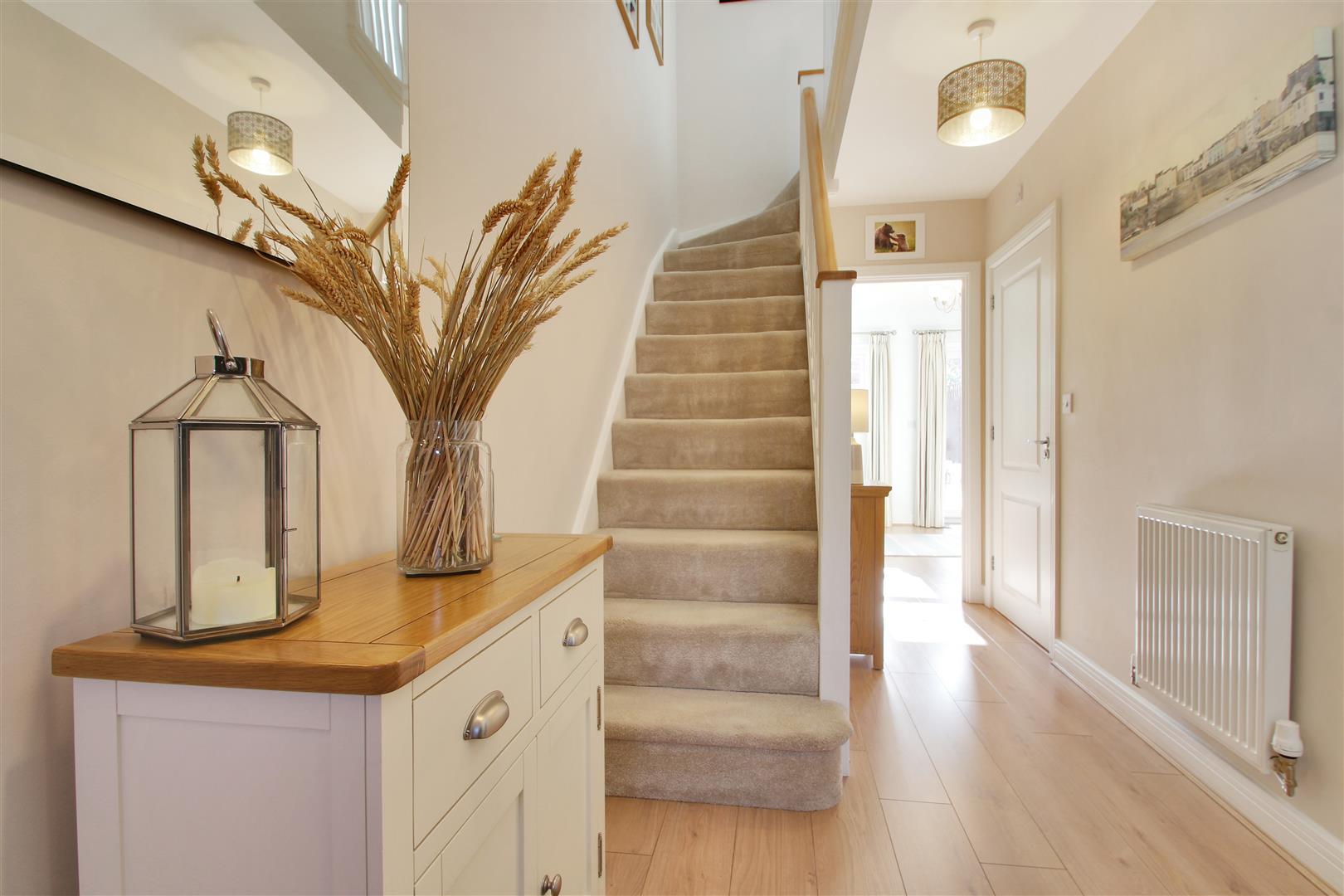 .Spacious entrance hall with Amtico light oak wooden flooring, stairs rising to first floor, cloaks cupboard housing gas boiler.