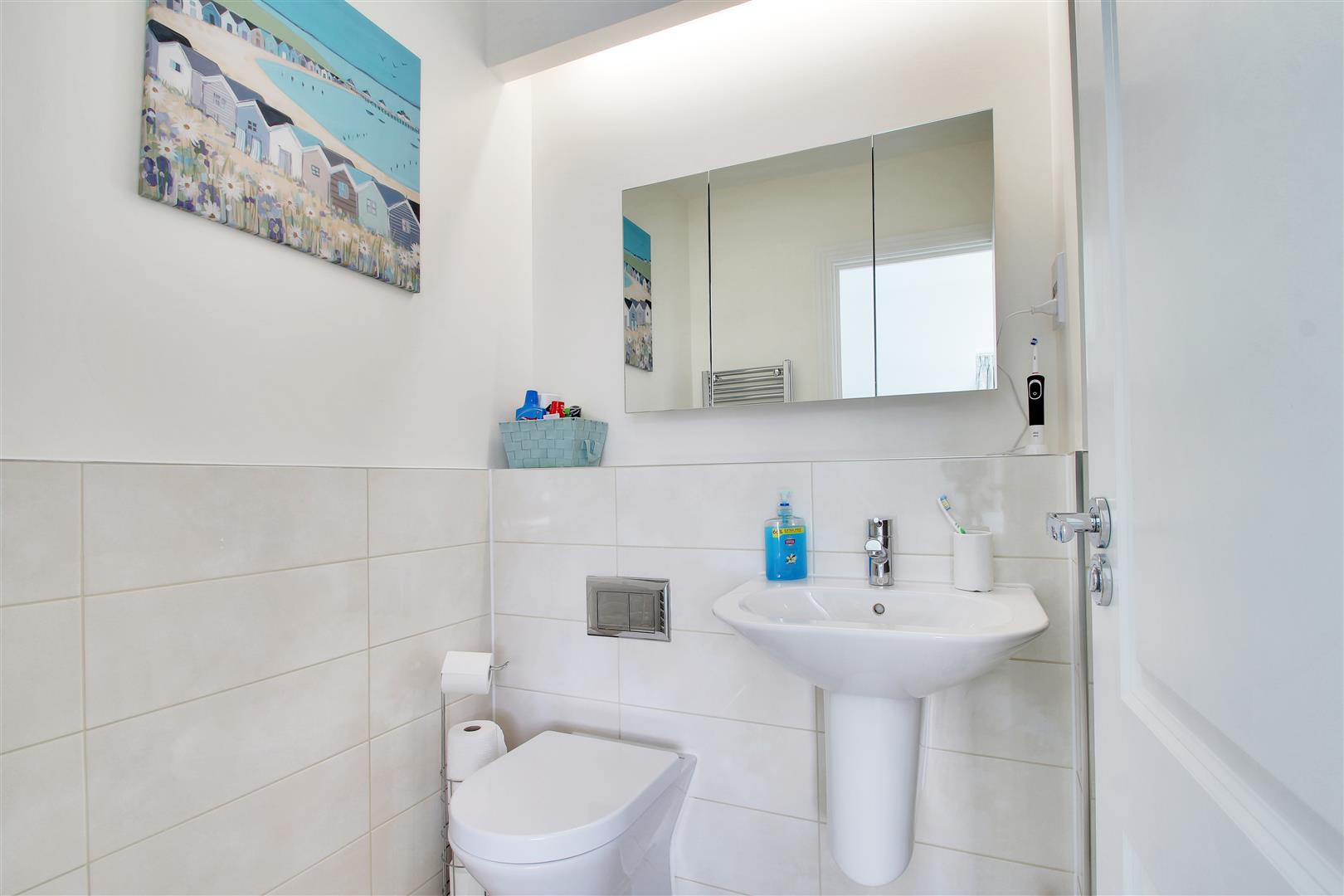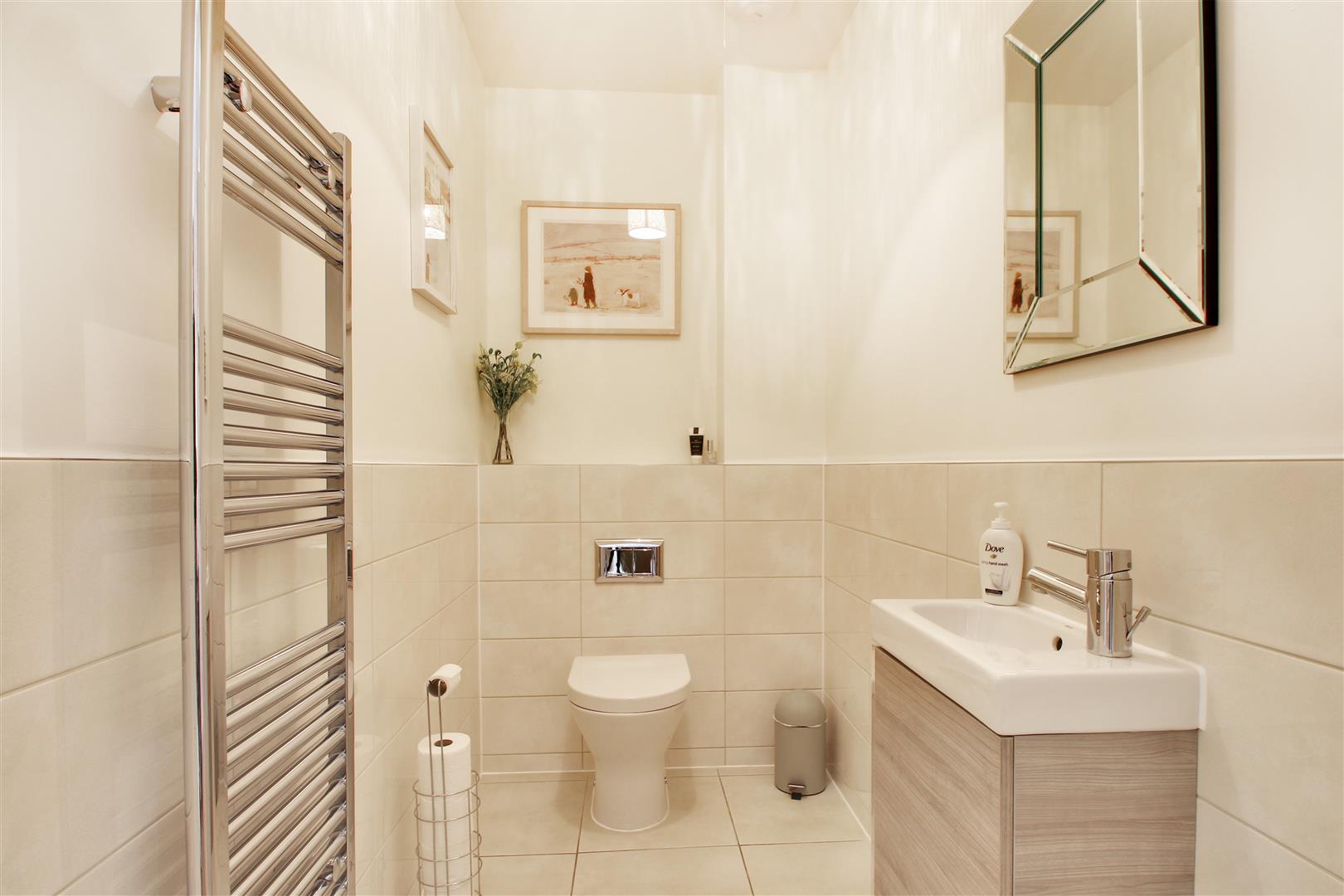 .Spacious ground floor cloakroom fitted with a white contemporary suite comprising concealed cistern w.c, wall mounted vanity unit with basin, chrome ladder towel rail, ceramic tiles flooring and walls to half height, extractor.