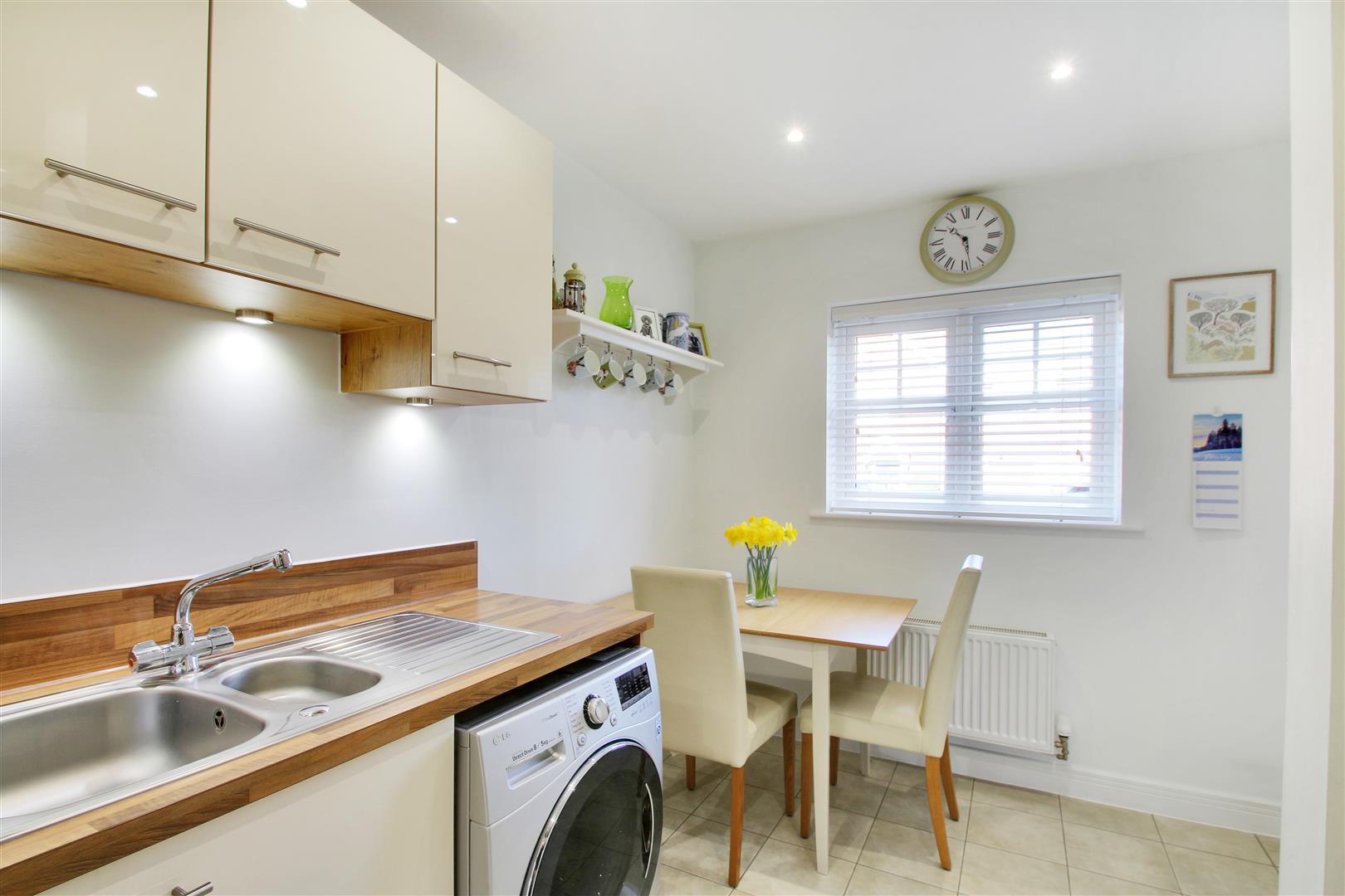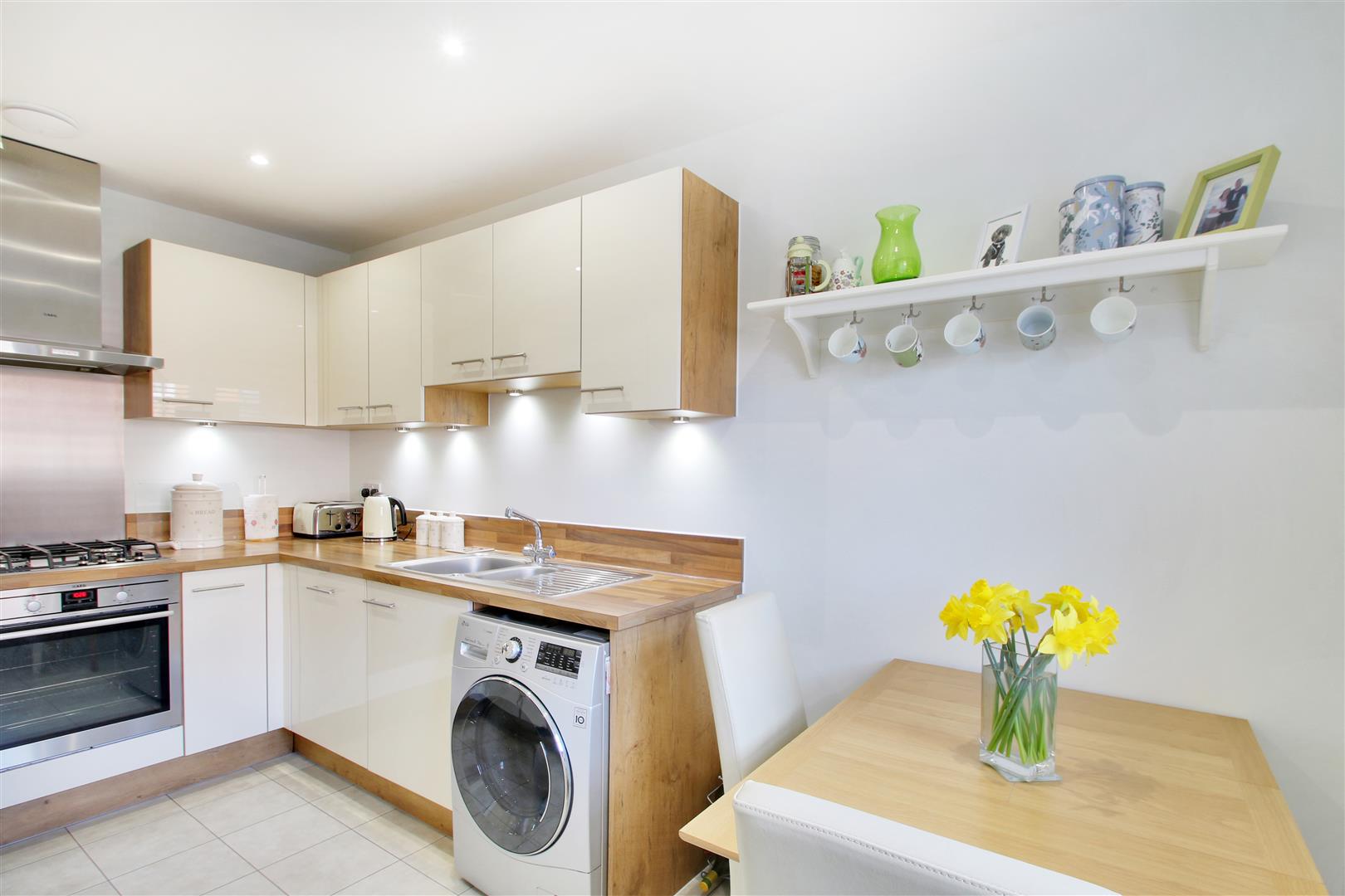 .Smart kitchen/dining room fitted with a range of gloss cream wall mounted cabinets and base units of cupboards and drawers, finished with woodblock worktops and upstands. AEG single oven, gas hob and extractor over, fully integrated AEG fridge /freezer in tall unit, fully integrated dishwasher, space and plumbing for washing machine, under cabinet lighting, ceramic tiled floor and inset ceiling lights. Space for dining table and chairs.