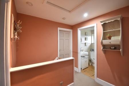 Double glazed frosted window to rear. White suite of low level WC, pedestal hand basin and offset panelled bath with separate shower and shower screen. Fully tiled walls. Chrome towel rail. Varnished floor boards.