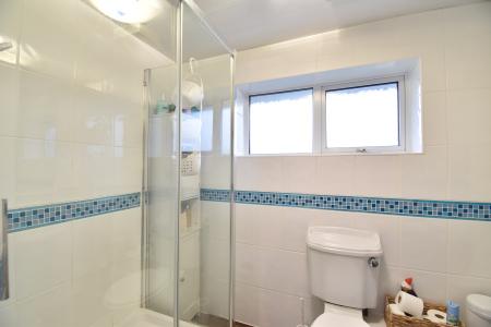 Double glazed frosted window to rear. White suite of low level WC, pedestal hand basin and large shower cubicle. Chrome heated towel rail. Fully tiled wall. Extractor.