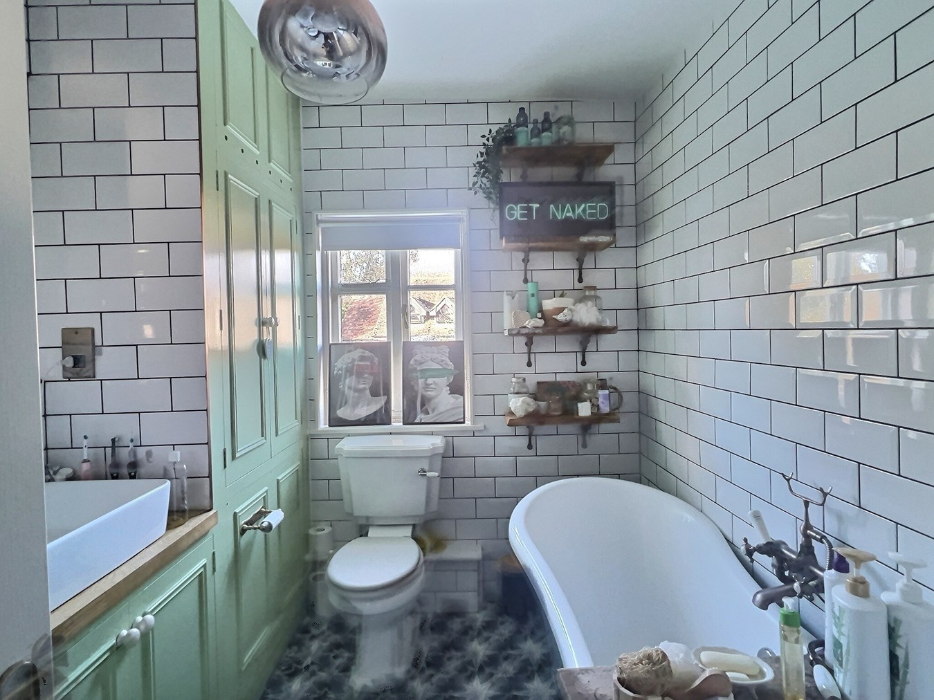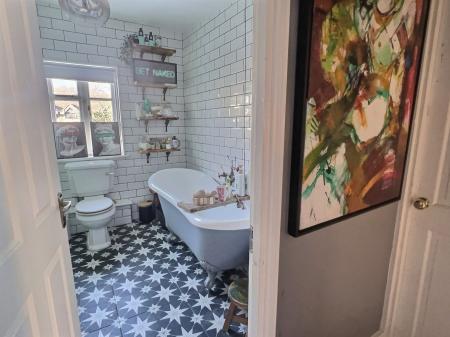 Window to rear. Suite comprising of low level WC, wash hand basin and freestanding claw foot bath. Fully tiled walls. Cupboard housing gas boiler. Towel radiator.