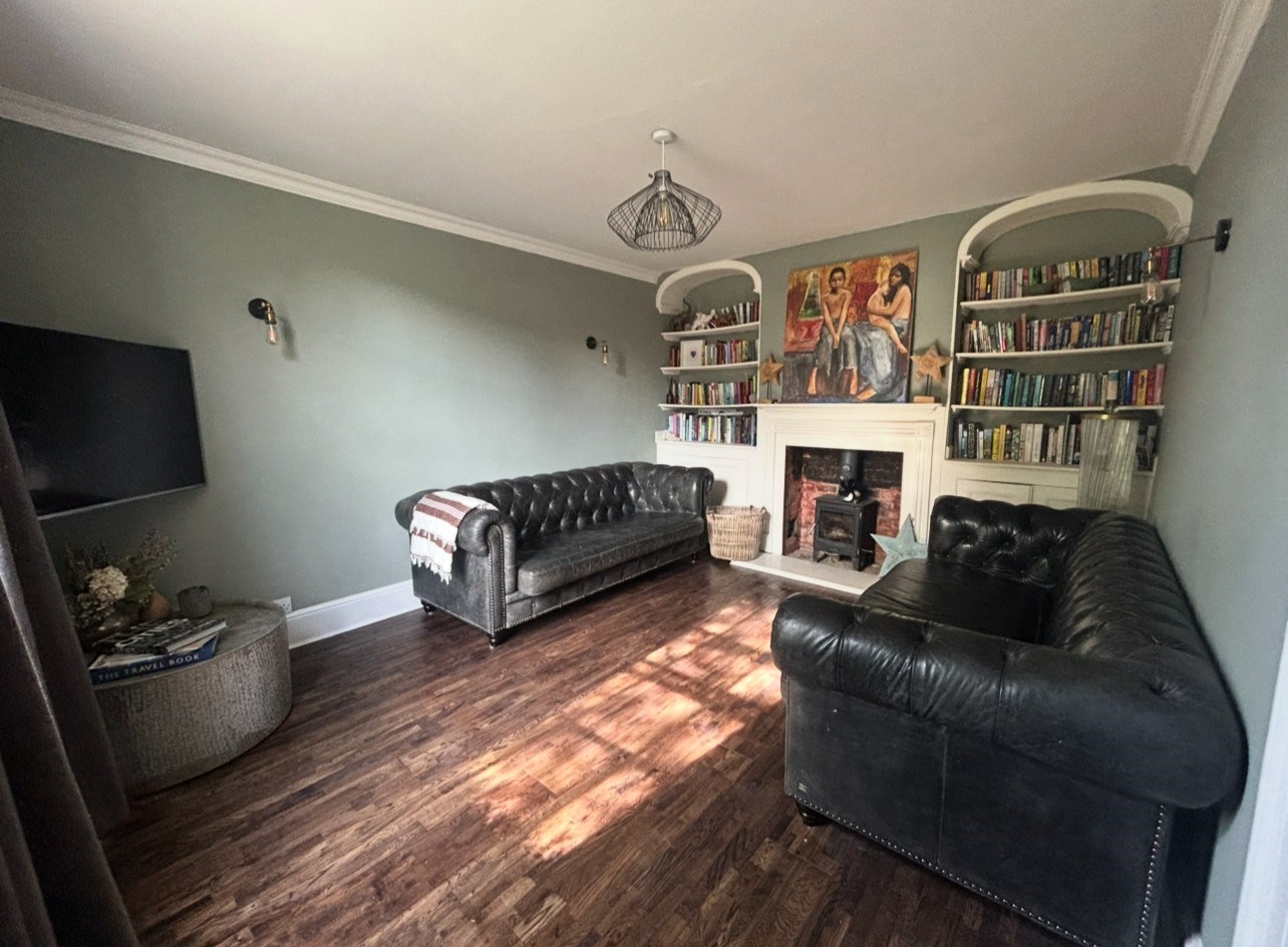 13' 7" x 11' 7" (4.14m x 3.53m) Sash window to front. Radiator. Wall lights. Built in book cases. Log burner with feature surround. Built in cupboard to both sides.