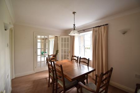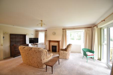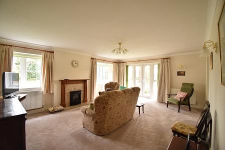 18' 6" x 14' (5.64m x 4.27m). Double glazed bay window and further double glazed window to side. Double glazed doors to patio area. Wood mantel fireplace with electric fire. TV point. Two radiators. Wall lights. BT point. Thermostat. Double casement doors to