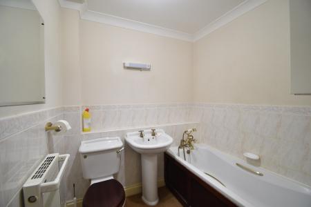 White suite comprising of low level WC, pedestal hand basin and panelled bath with shower attachment. Part wall tiling. Radiator. Extractor.