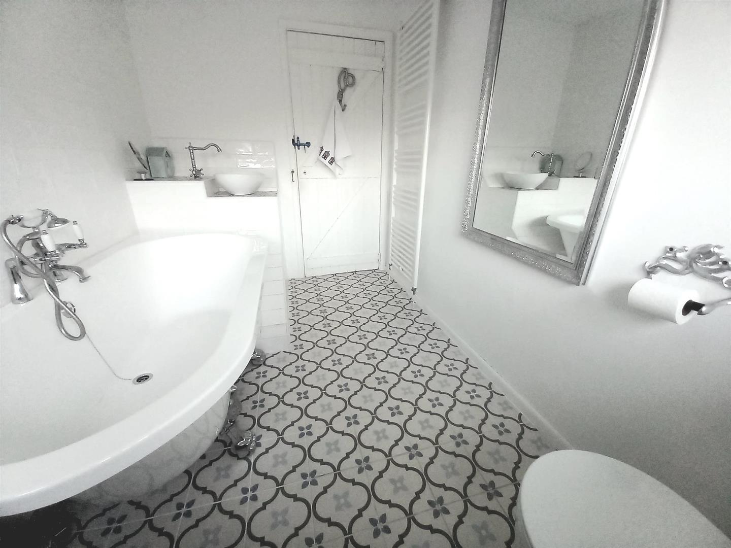 The recently refurbished bathroom has an attractive tiled floor, freestanding bath, WC and wash basin.