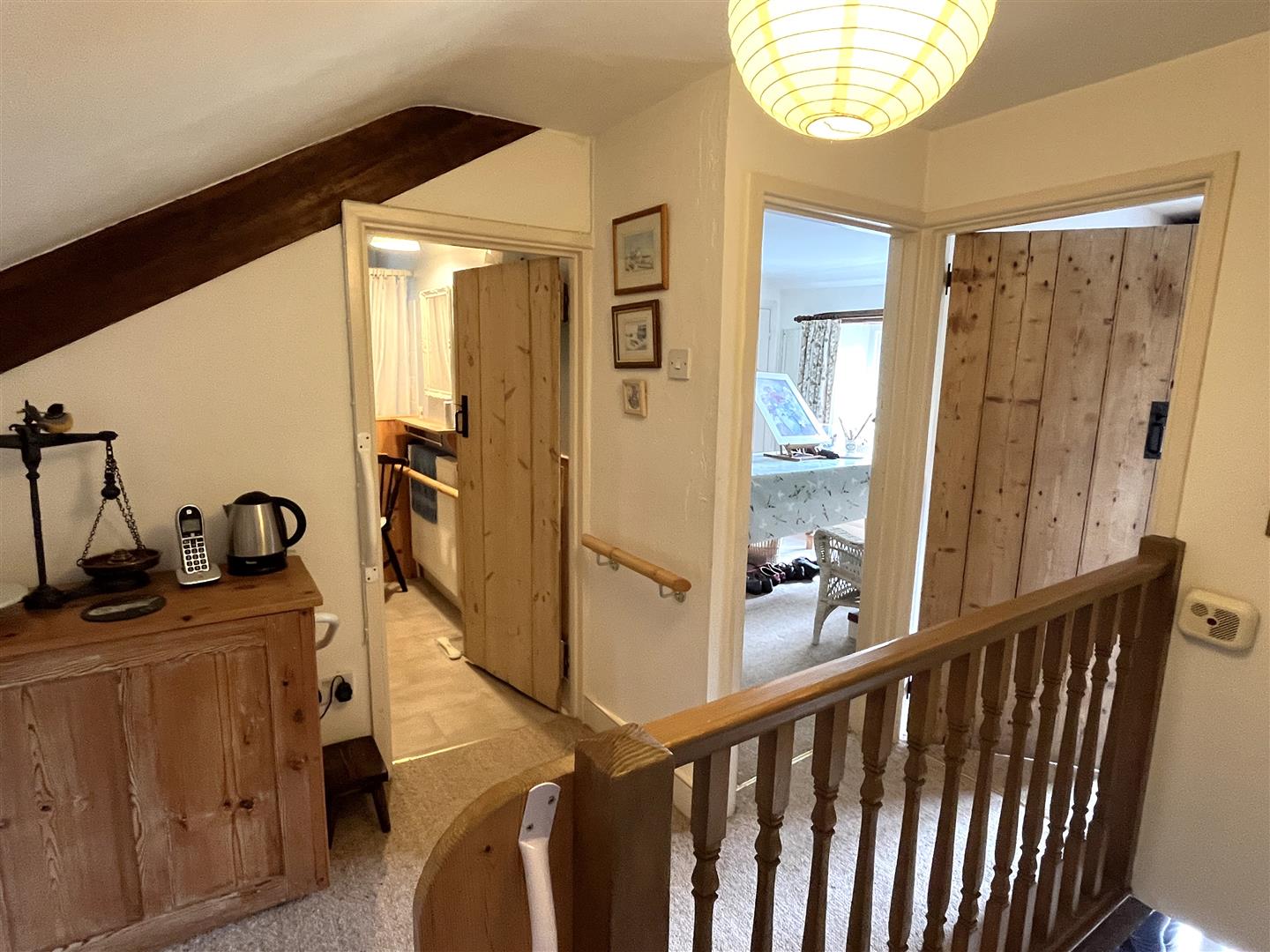 Approached along the path through the pretty front garden area, surrounded by greenery and flowers, this picture perfect cottage appeals from the first moment. The half-glazed front door opens to a spacious kitchen/dining room with windows front and back, bringing in light and views over the water. The charming cottage-style kitchen offers plenty of storage, an impressive Heritage Oil-fired Range cooker within a most attractive recessed stone fireplace, and traditional terracotta tiled floor. There is plenty of room for a large dining table and chairs. The back door, a useful stable door, opens to the lane at the rear of the cottage. From the kitchen, stairs lead up to the first floor.