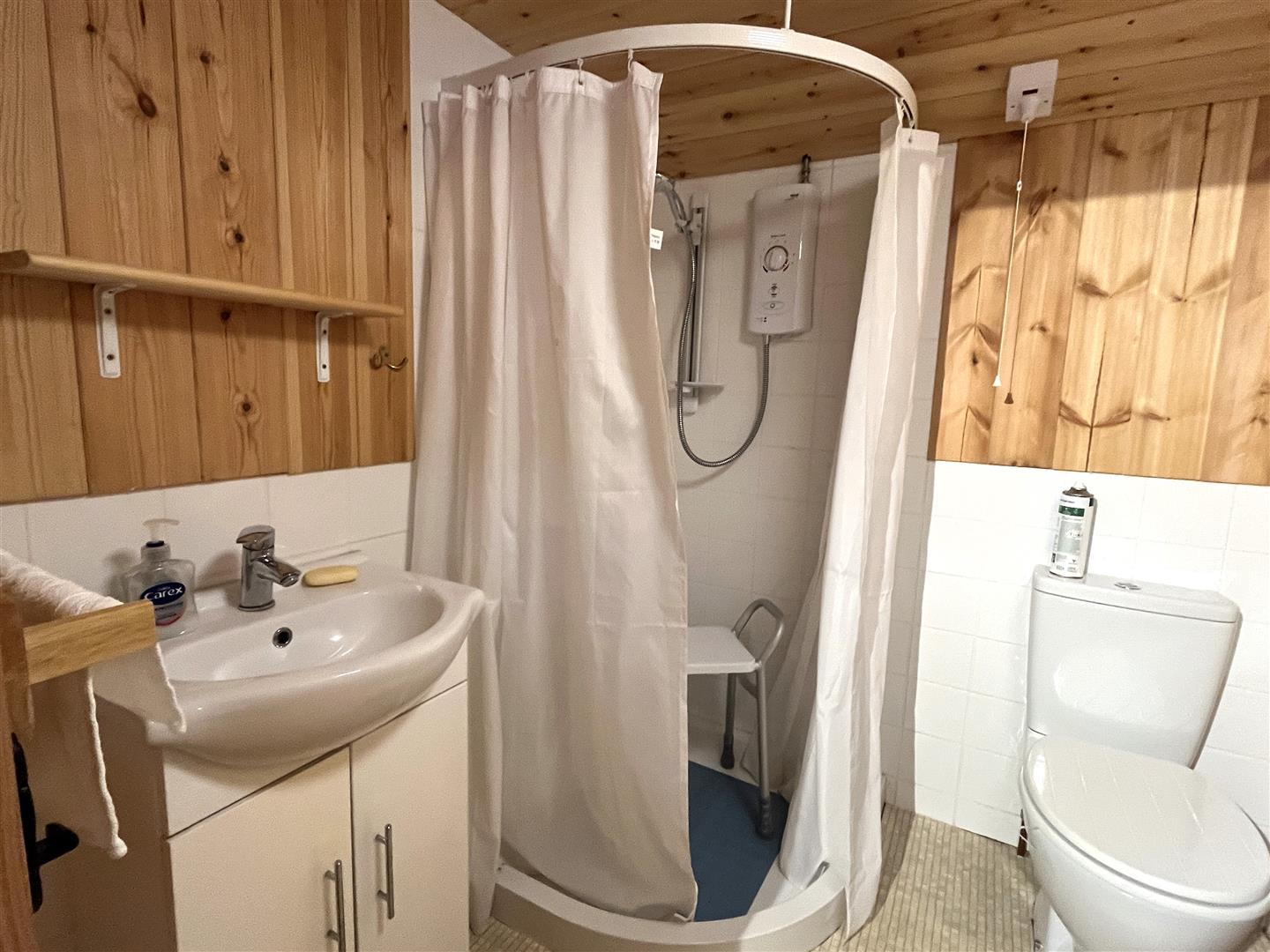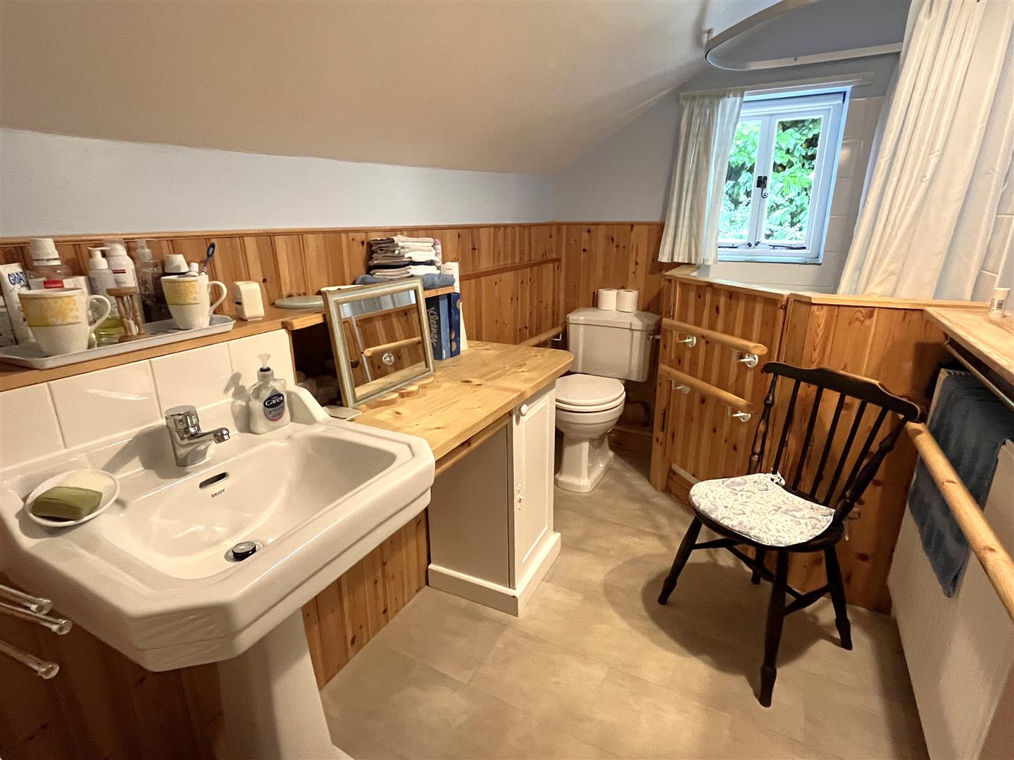 The family bathroom, with tongue and groove panelling, comprises corner shower cubicle, basin and w.c.