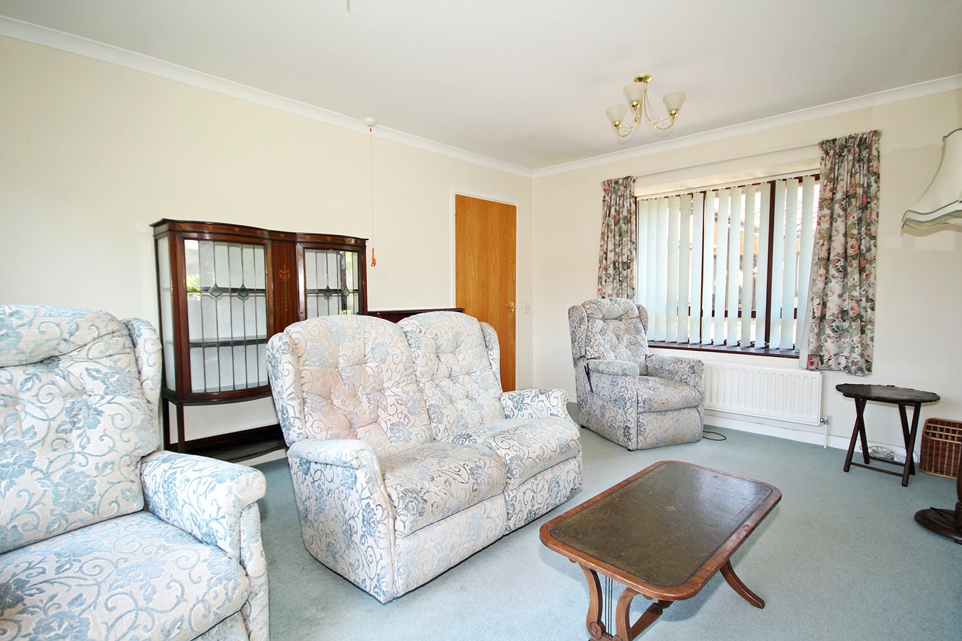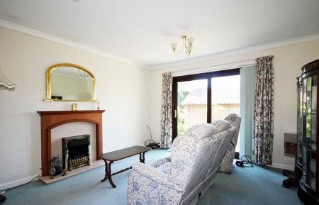 With feature fireplace, dual aspect box bay window to side and sliding patio door to rear, overlooking small patio area. Radiator, sky TV point, twin ceiling lighting, security cord.