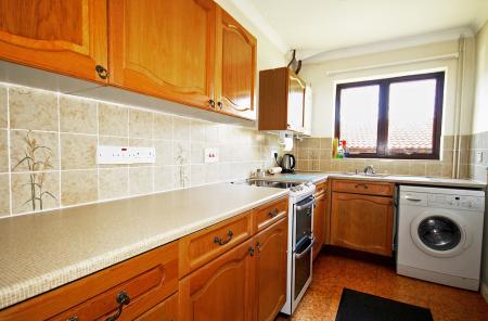 Range of base and eyelevel cupboards with matching worktops, space for slot-in double oven and ceramic hob, plumbing for washing machine, stainless steel sink unit and mixer tap wall, mounted Worcester Bosch gas boiler. Wood and double glazed window to rear.