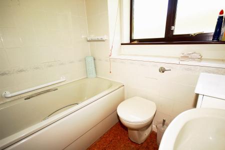 2.0m x 6.4m (6' 7" x 21' 0") A three-piece coloured suite: mixer tap with shower attachment, low level WC, pedestal hand basin, shaver light ,shaver point, radiator frosted and double glazed window to rear aspect.
