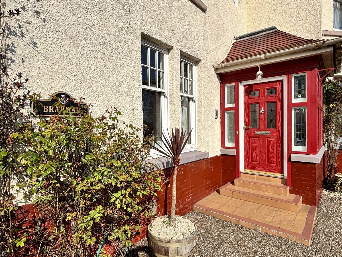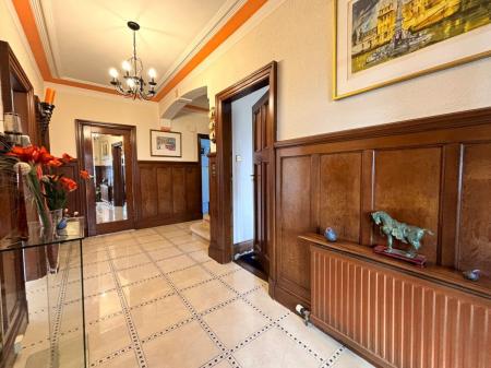 Set behind a signed gatepost entrance, the property welcomes you via a decorative porch into a grand L-shaped reception hall, featuring exquisite original Oregon pine paneling. Generous reception rooms include a bright, bay-windowed sitting room, a formal dining room with front garden views, and a tranquil rear lounge which could serve as a fifth bedroom. Also on the ground floor is a well-appointed kitchen, utility room, shower room, cloakroom, and extensive built-in storage.