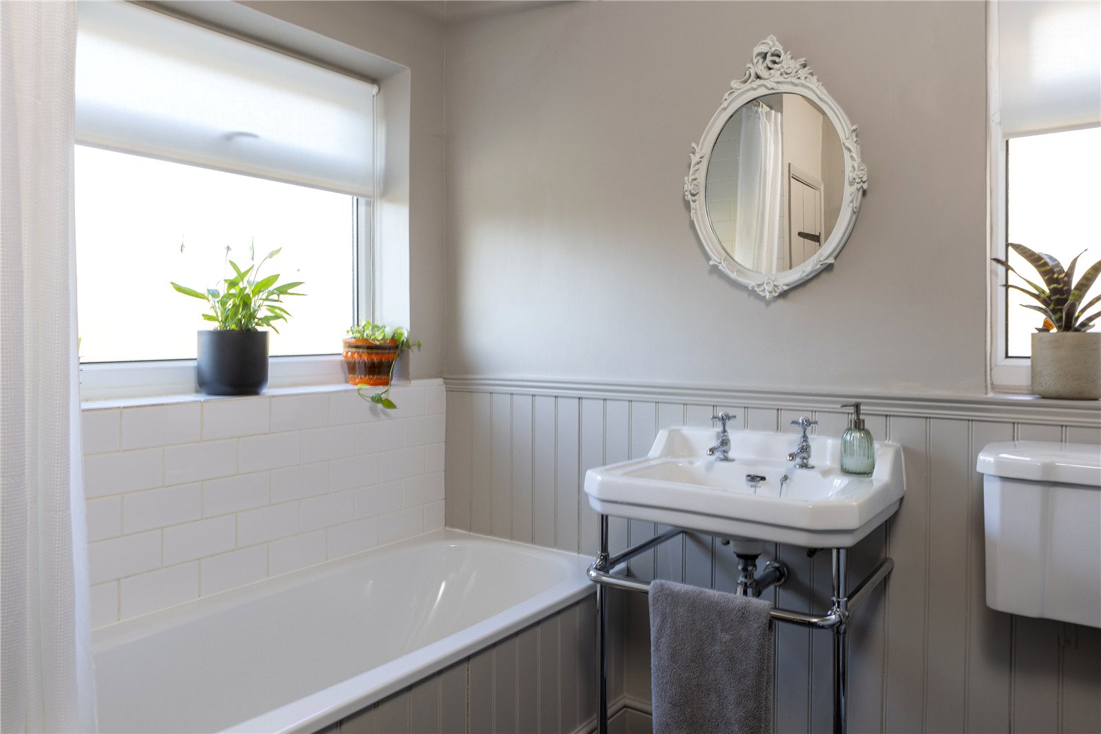 • Charming family bathroom with bath, half-height panelling and tasteful traditional styling