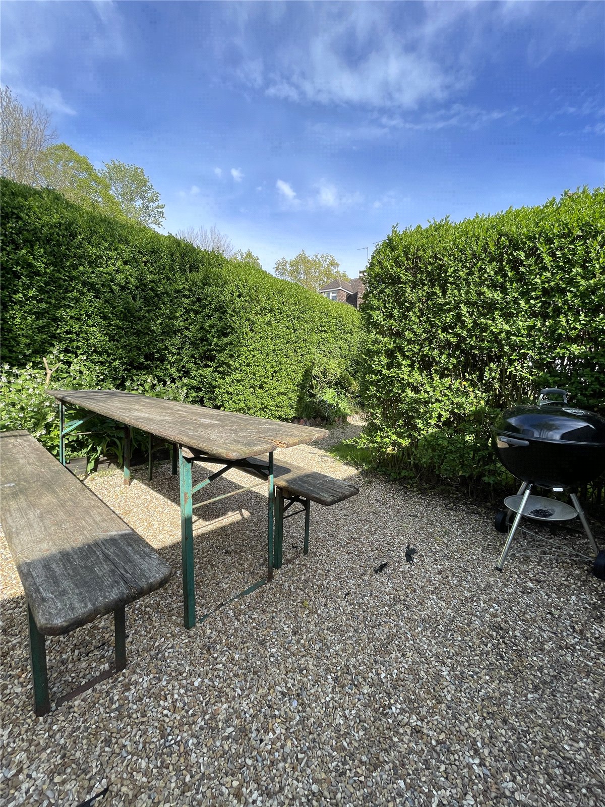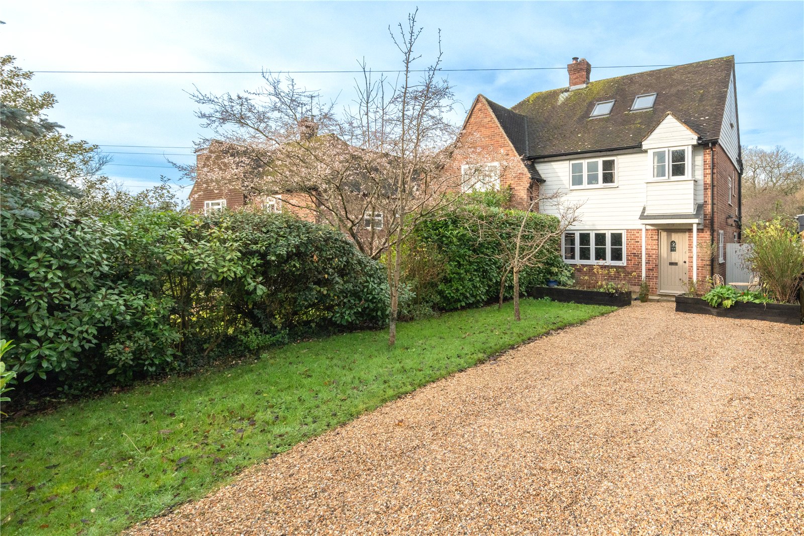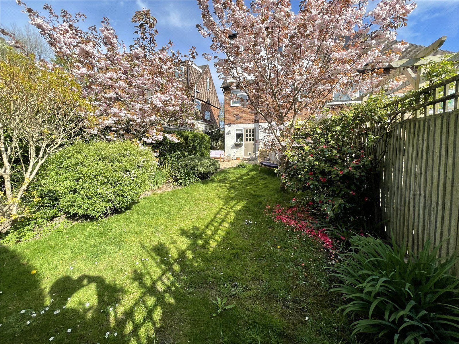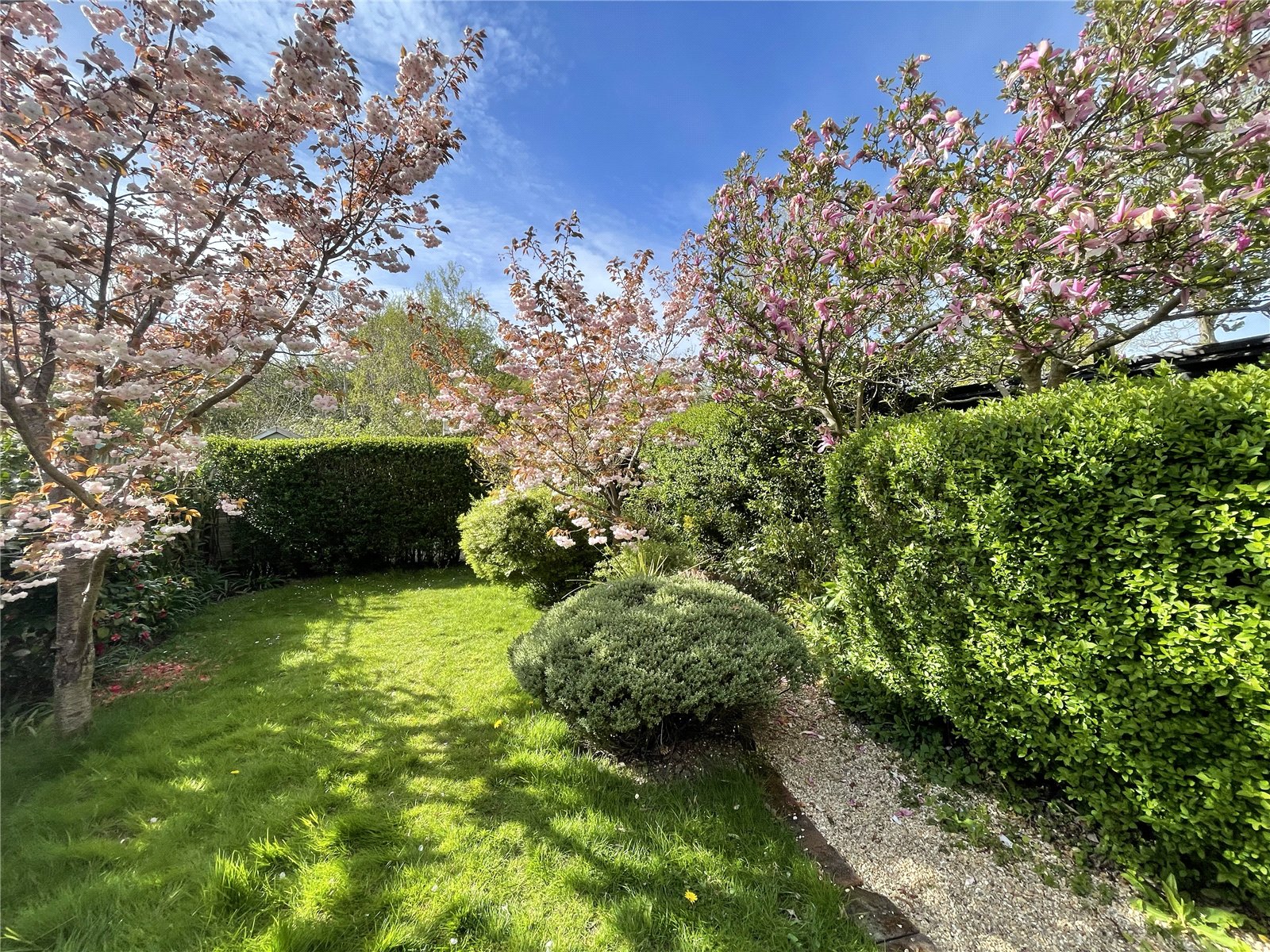 To the rear, the garden unfolds as a private and versatile outdoor retreat. A mixture of lawn, gravelled terraces and sheltered seating areas provide ideal spots for relaxation, alfresco dining or entertaining. Mature cherry blossom, established shrubs and structured hedging create a sense of seclusion and charm, while pathways wind through different zones of the garden for children to explore or adults to enjoy quiet corners.