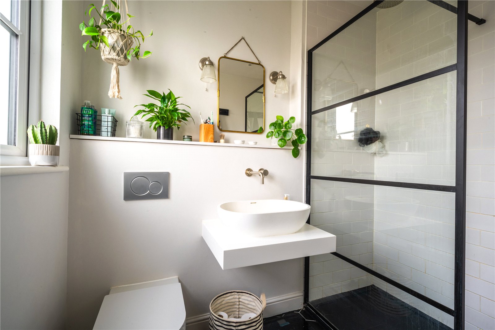 EN-SUITE: This beautifully finished en-suite offers a stylish and modern complement to the principal bedroom. Designed with clean lines and a calming palette, the space features a sleek walk-in shower with a black-framed glazed screen and elegant metro tiling. A floating vanity with a sculptural countertop basin and wall-mounted brass tap adds a boutique feel, enhanced by chic wall lighting. The window provides natural light and ventilation, while the integrated ledge offers practical storage and a perfect spot for greenery. Completed with a concealed-cistern WC and high-quality fixtures throughout, this en-suite delivers both luxury and functionality in equal measure.