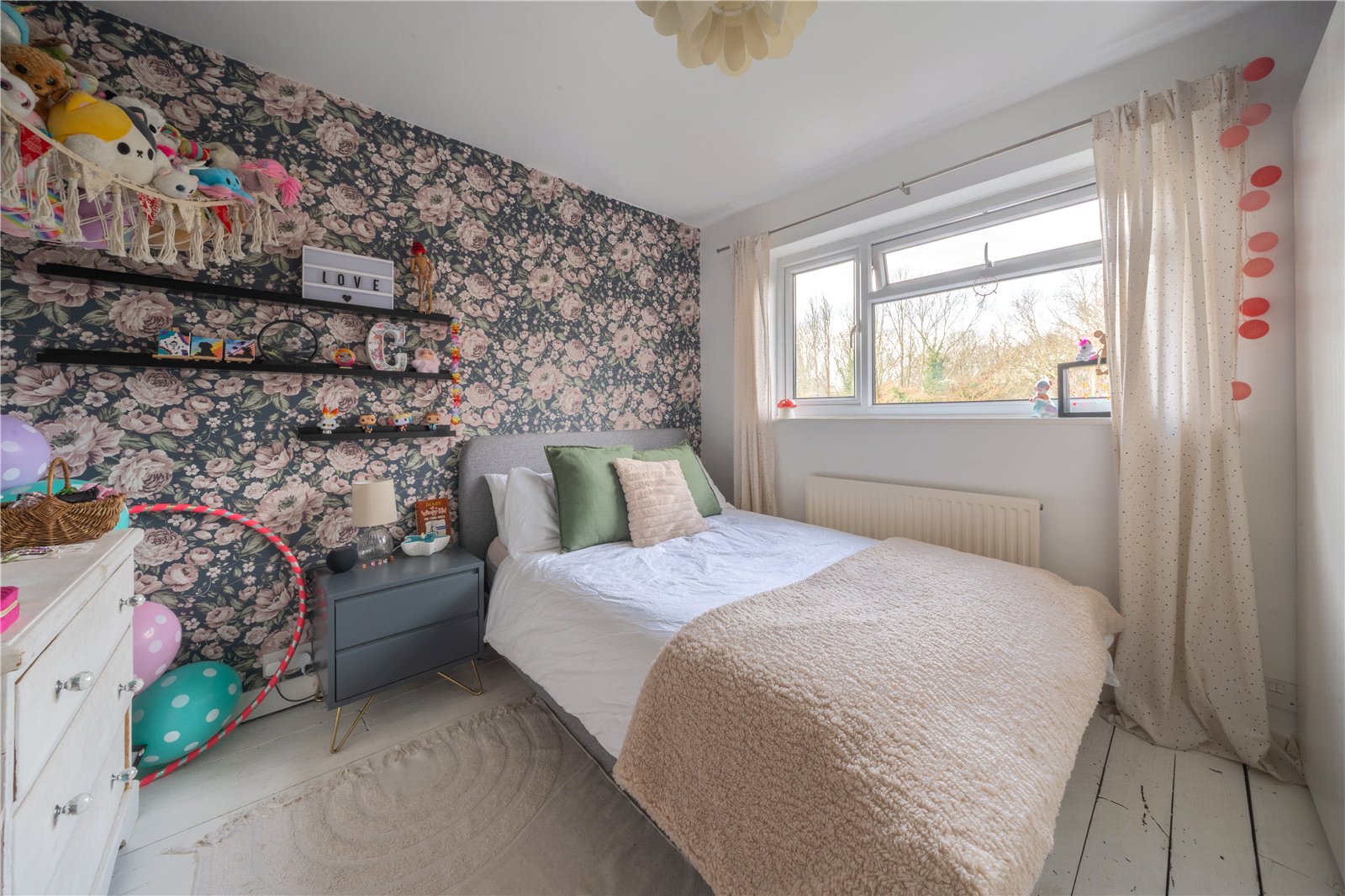 BEDROOM 3: This delightful bedroom offers a warm and inviting space, beautifully styled with a feature floral accent wall that adds character and charm. A large picture window fills the room with natural light and provides pleasant views over the rear garden treetops, creating a bright and peaceful atmosphere throughout the day. The room comfortably accommodates a double bed alongside additional furnishings, with thoughtful décor and soft textures contributing to its cosy, homely feel. Ideal as a child’s bedroom, guest room, or secondary double, this is a wonderfully versatile and well-presented space within the home.