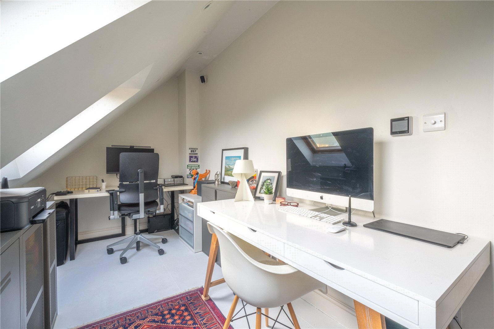 OFFICE/BEDROOM 4: This superbly appointed space offers exceptional versatility, currently arranged as a stylish and functional home office. Set within the eaves, the room enjoys an abundance of natural light from twin electric Velux windows with rain sensors, which frame far-reaching views over the surrounding countryside. The sloped ceilings create a characterful yet airy feel, while the neutral décor provides a calm and productive working environment. There is ample room for multiple desks and storage solutions, making it ideal for remote working, creative pursuits, or study. Alternatively, the space can be easily reconfigured as a comfortable additional bedroom. Thoughtfully designed and beautifully presented, this room is a valuable and flexible part of the home.
