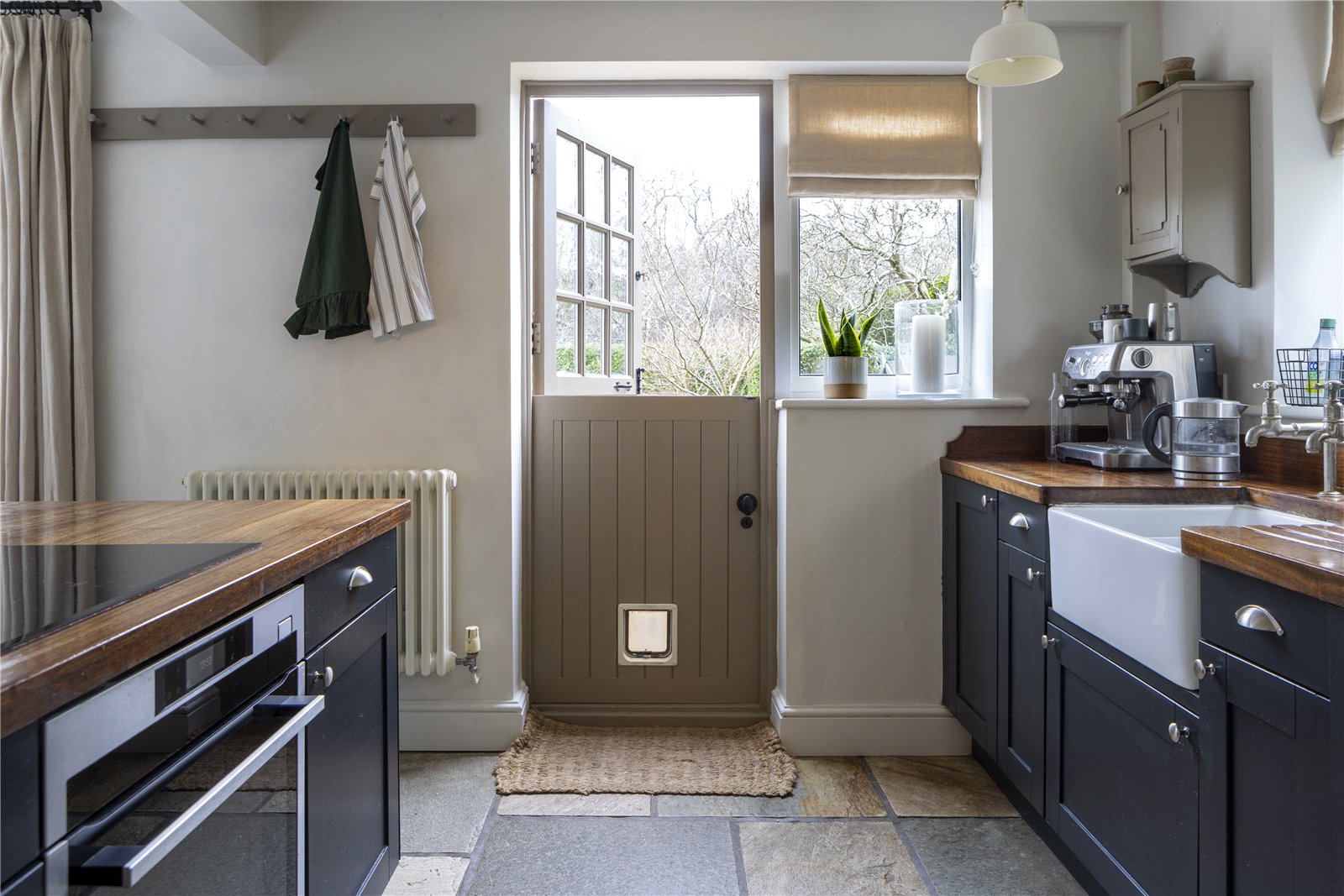 KITCHEN/DINING ROOM: This beautifully designed open-plan kitchen and dining space forms the heart of the home, combining characterful touches with modern functionality. The kitchen features shaker-style cabinetry in a rich dark tone, complemented by Iroko solid wood kitchen worktops, a farmhouse-style sink and underfloor heated oyster slate floor . A central island provides additional workspace and houses integrated appliances, making it ideal for both everyday cooking and entertaining. Generous windows and a stable door invite plenty of natural light while offering charming views out to the garden.