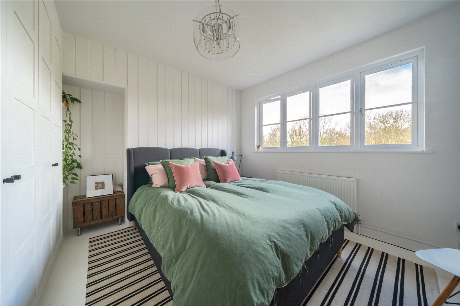 PRINCIPLE BEDROOM: This bright and stylish principal bedroom offers a wonderfully calming atmosphere, enhanced by its generous proportions and contemporary décor. A wide bank of windows floods the room with natural light and frames serene views over the rear garden and backdrop of trees. The space is thoughtfully designed, featuring full-height panelled walls, fitted wardrobes, and a chic modern colour palette that complements the room’s clean, fresh aesthetic.