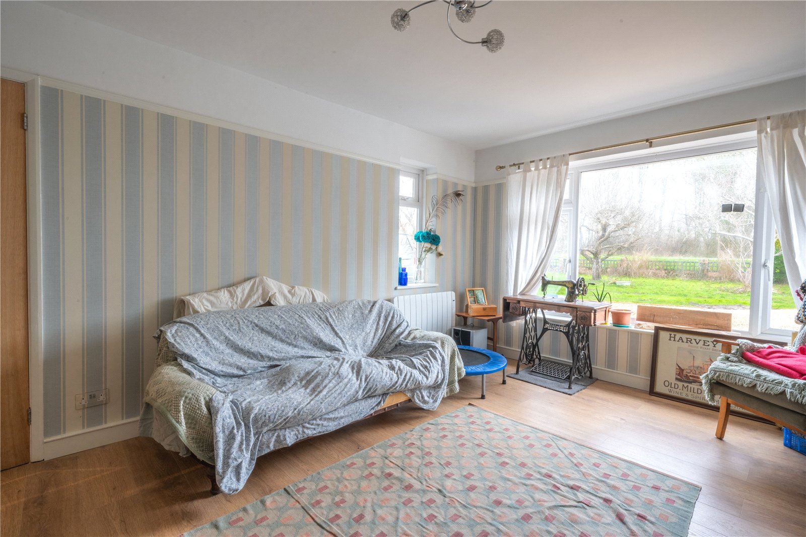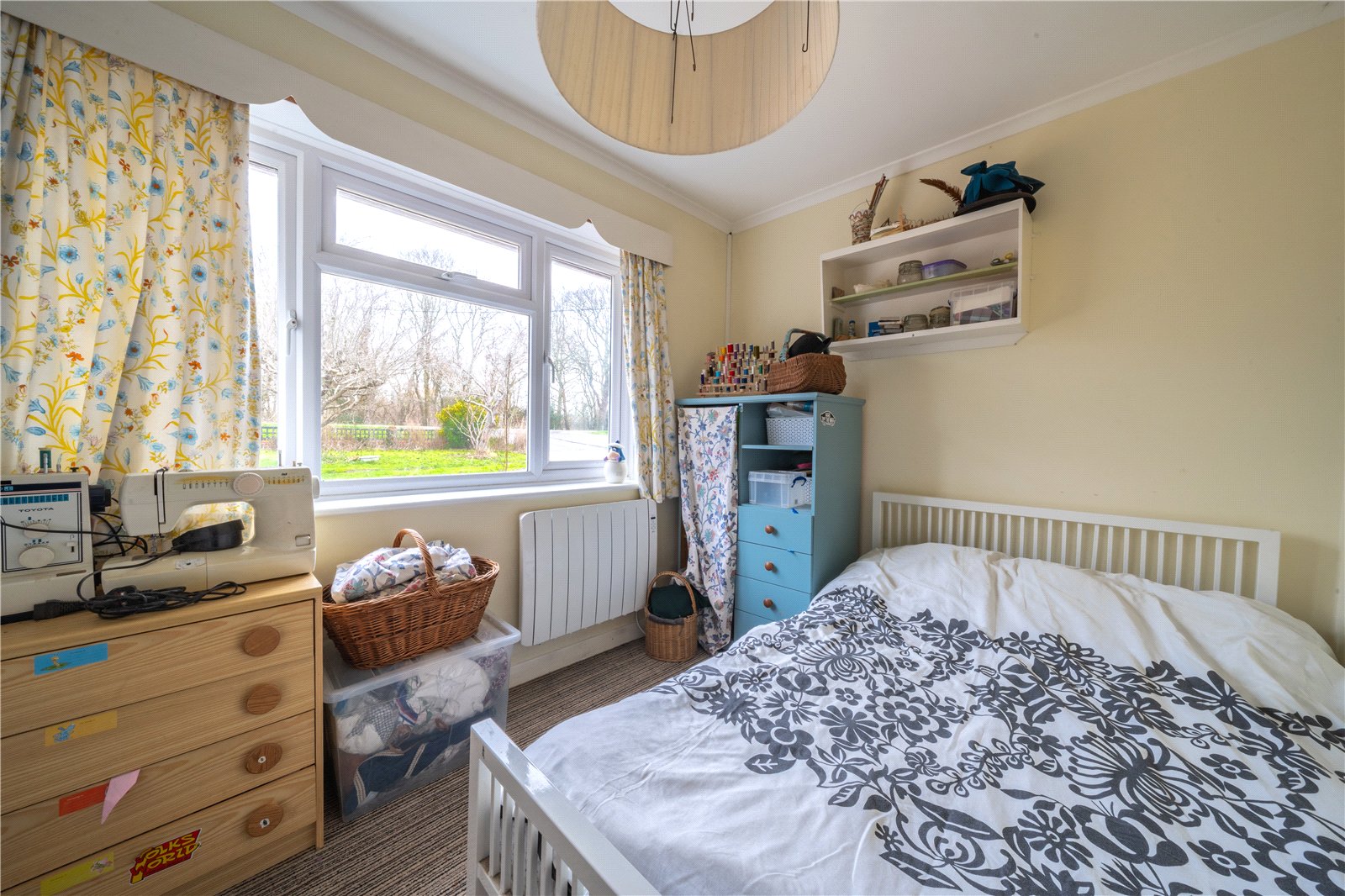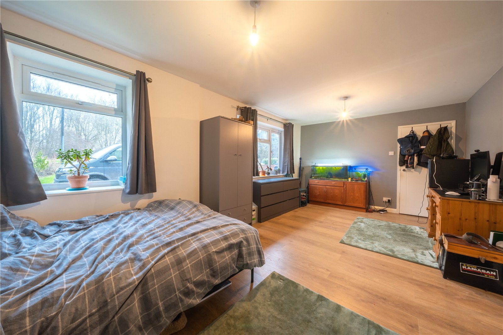 BEDROOM 5: A well-presented and comfortable bedroom enjoying excellent natural light from a large window with pleasant outlook over the surrounding greenery. The room provides ample space for a double bed alongside freestanding furniture and benefits from a warm, neutral colour palette that creates a bright and welcoming atmosphere. Fitted with a modern radiator beneath the window and finished with practical flooring and ceiling lighting, the room is well suited for use as a bedroom, guest room or home office. The proportions and natural light make this an appealing and versatile space within the property.