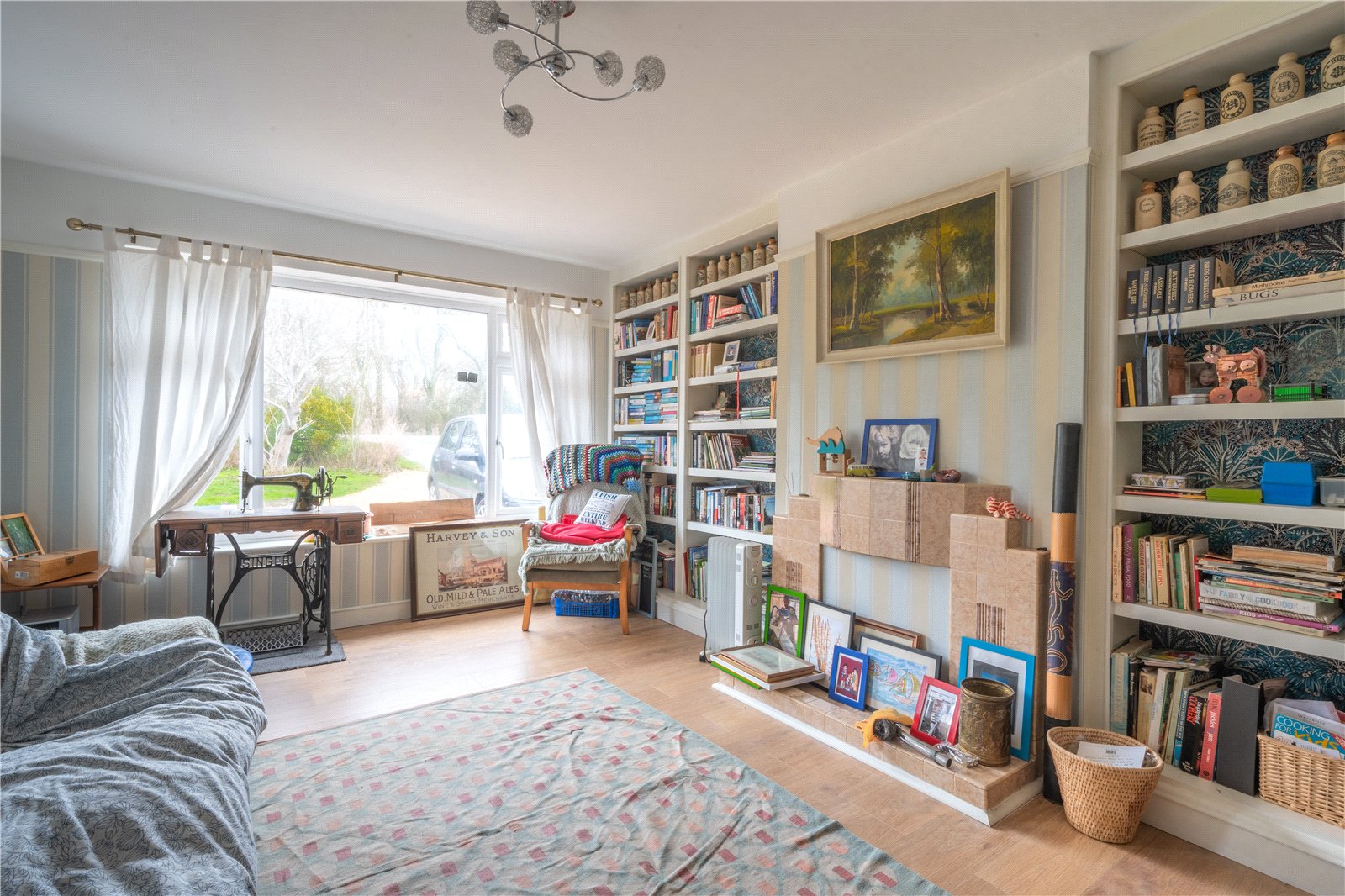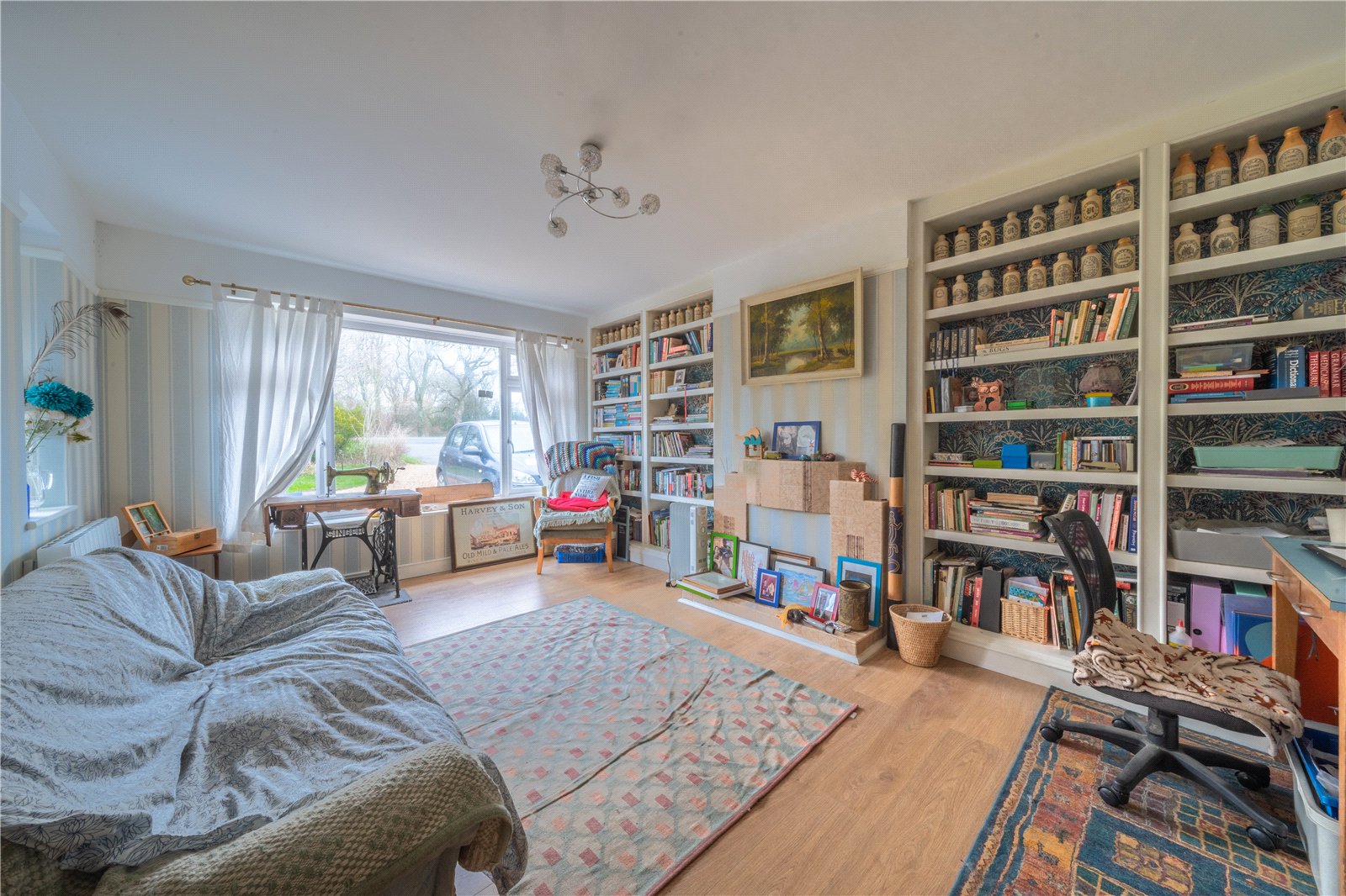 LIVING ROOM: The living room is a bright and welcoming space, filled with natural light from a large picture window overlooking the garden. Generous in size, the room offers excellent flexibility for both relaxation and entertaining, with clearly defined areas for seating and reading or hobbies.