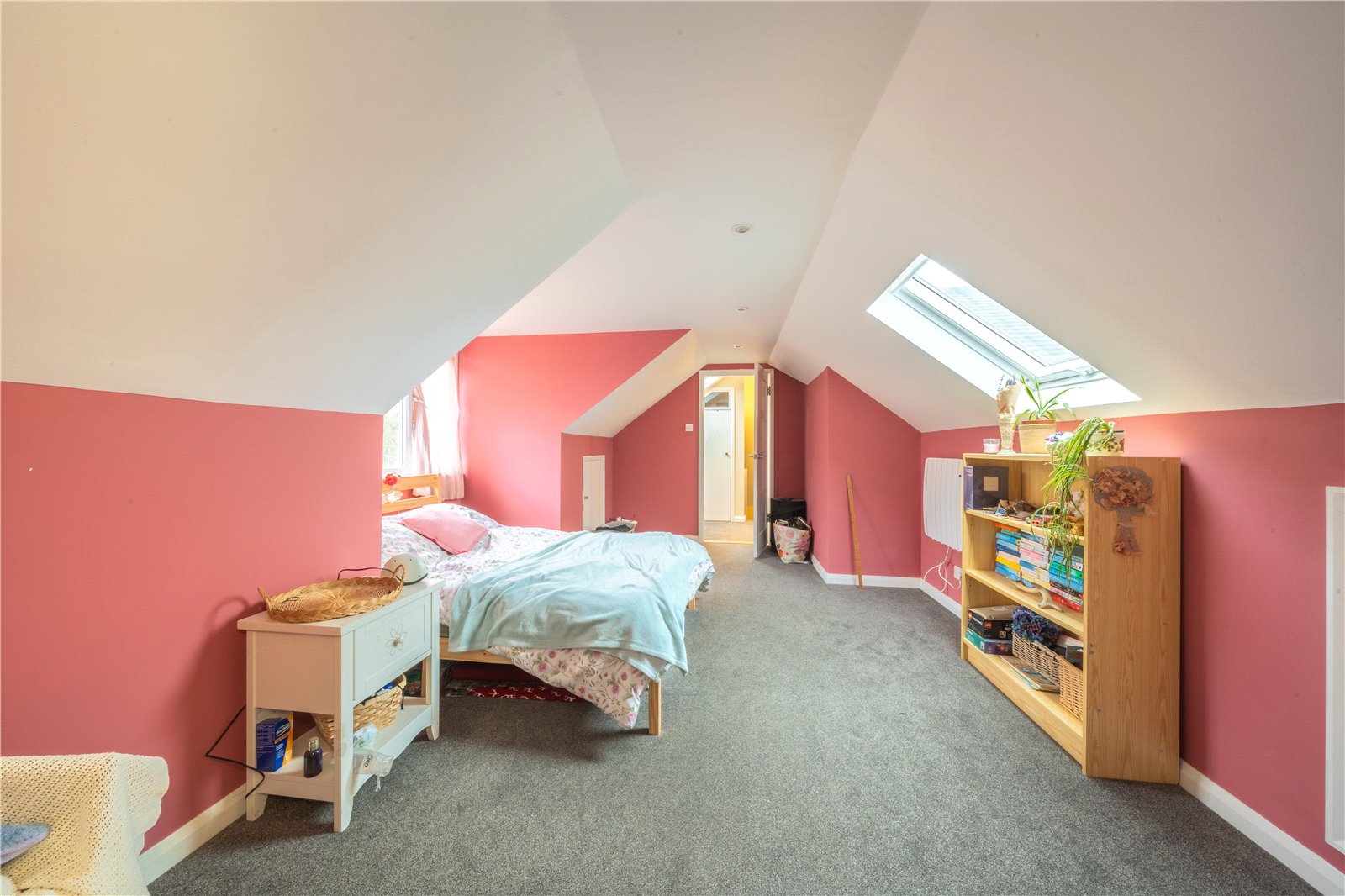BEDROOM 2: A generous and characterful bedroom positioned on the upper floor, featuring vaulted ceilings and attractive sloping rooflines that create a sense of space and individuality. The room is well proportioned, comfortably accommodating a double bed along with freestanding furniture, and benefits from excellent natural light via a front-facing window and a rooflight. Finished with soft carpeting and recessed ceiling lighting, the bedroom offers a bright yet cosy atmosphere.