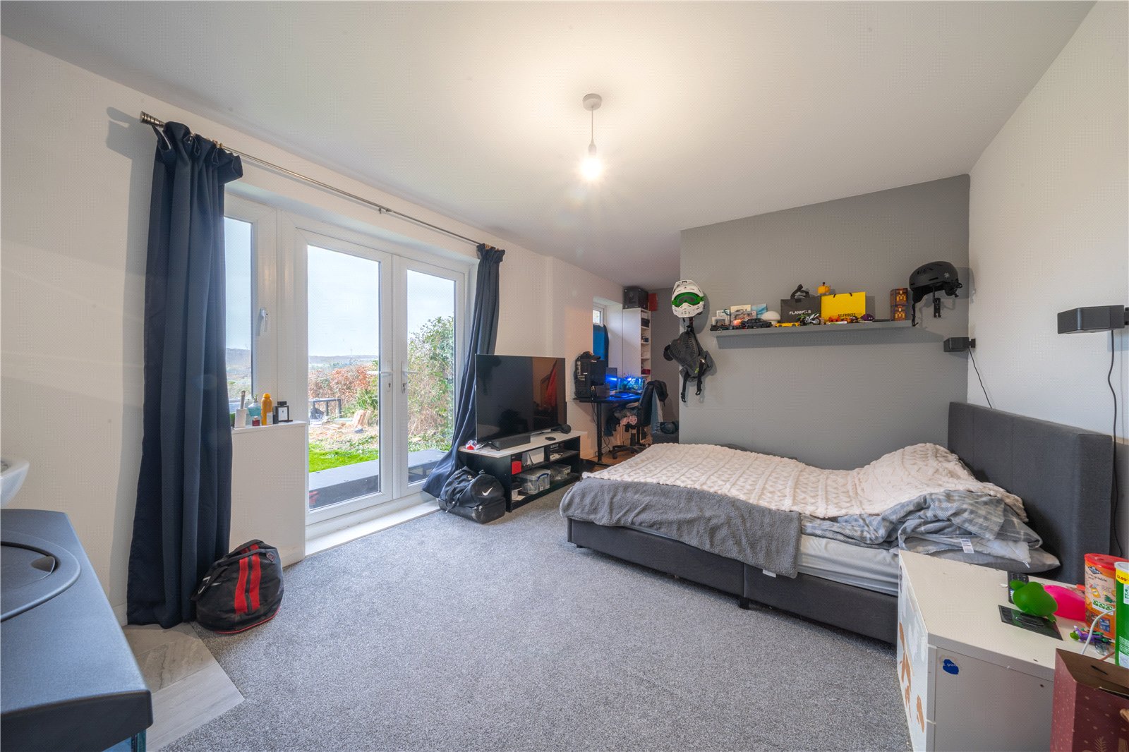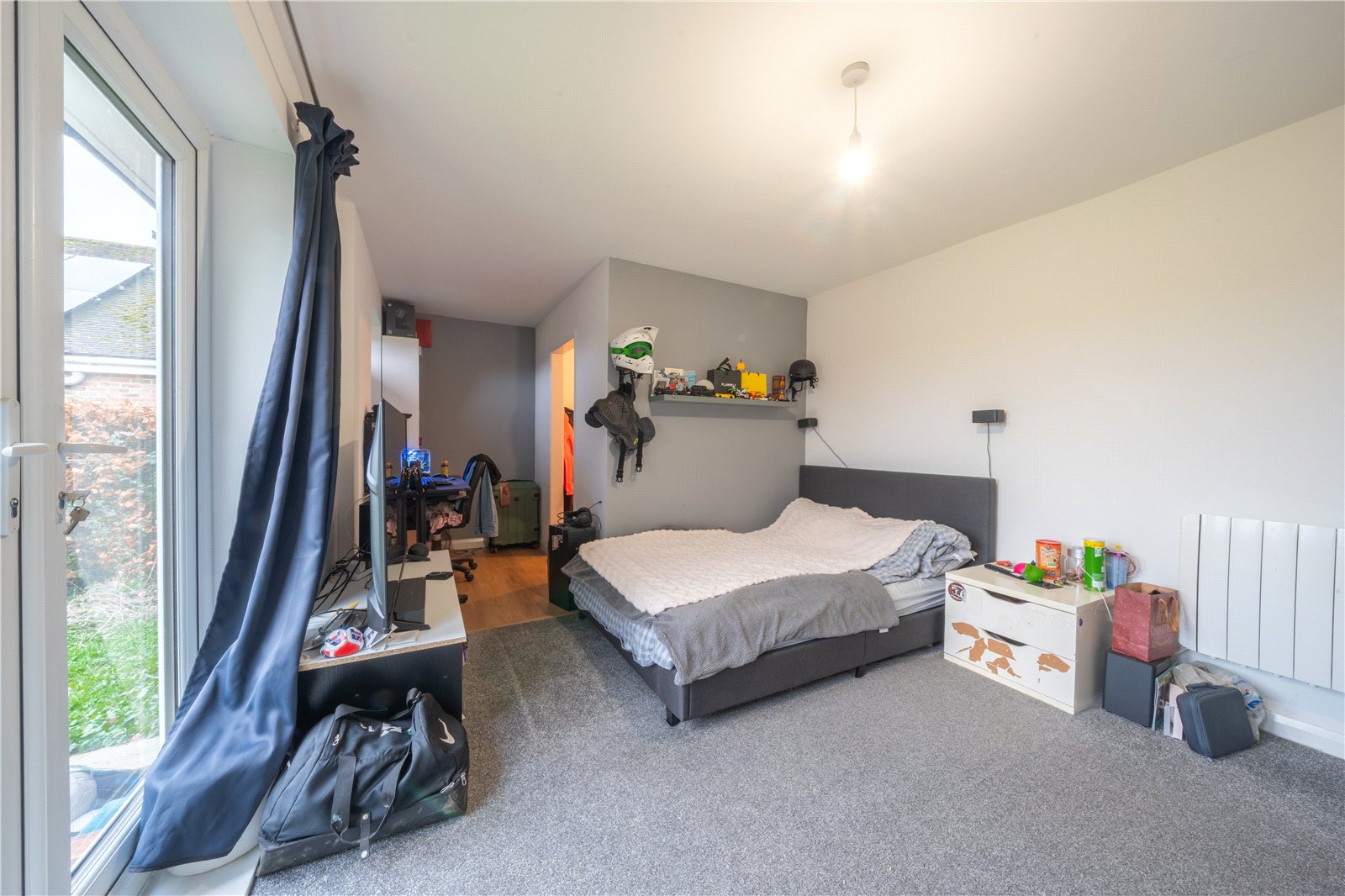 BEDROOM 3: A generously proportioned and well-presented bedroom enjoying excellent natural light via full-height glazed doors opening directly onto the garden, creating a bright and airy feel throughout. The room comfortably accommodates a double bed along with additional furniture and benefits from neutral décor, soft carpeting and ceiling lighting. A distinct dressing room area adjoins the bedroom, providing valuable additional storage space with room for wardrobes, clothing rails and accessories, enhancing both practicality and functionality. Overall, this is a versatile and well-sized bedroom offering an attractive outlook and direct garden access.