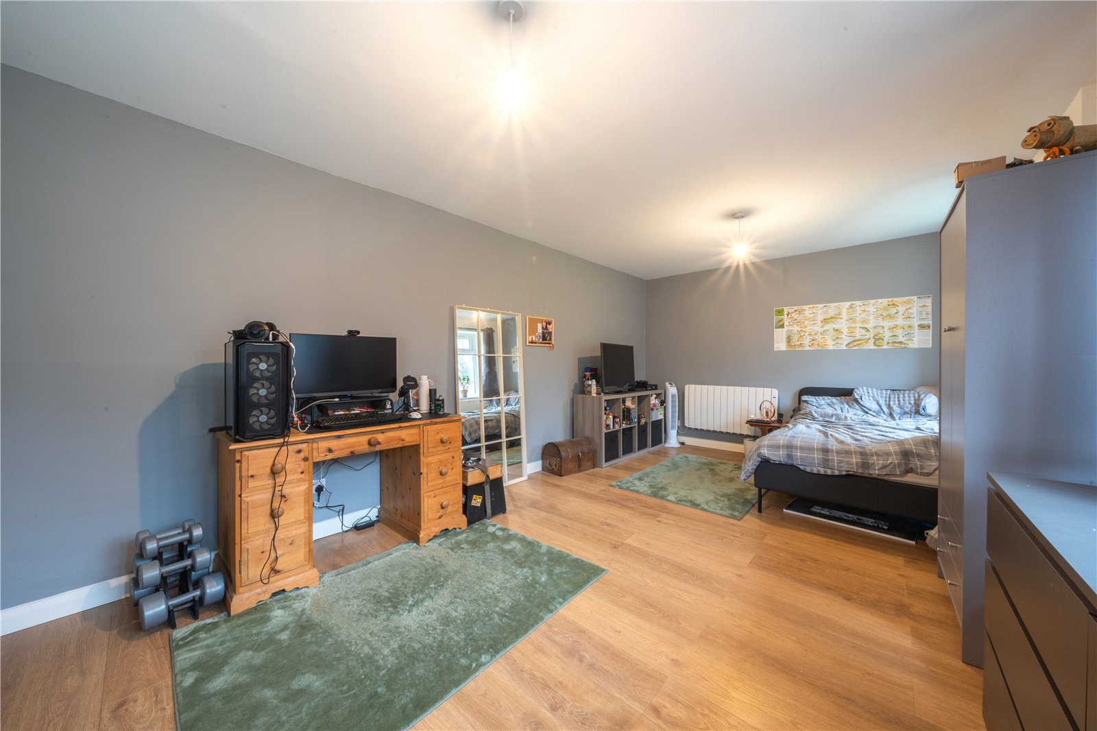 BEDROOM 4: A generously proportioned and versatile bedroom offering excellent natural light from dual-aspect windows overlooking the grounds. The room comfortably accommodates a double bed along with substantial freestanding storage and additional furniture, while still retaining a strong sense of space. Finished with neutral décor, wood-effect flooring and simple ceiling lighting, the room presents a clean and practical environment suitable for a variety of uses, including a principal bedroom, guest suite or combined bedroom/home office. A modern radiator ensures comfort year-round, and the overall proportions make this an adaptable and appealing room for a range of buyers.