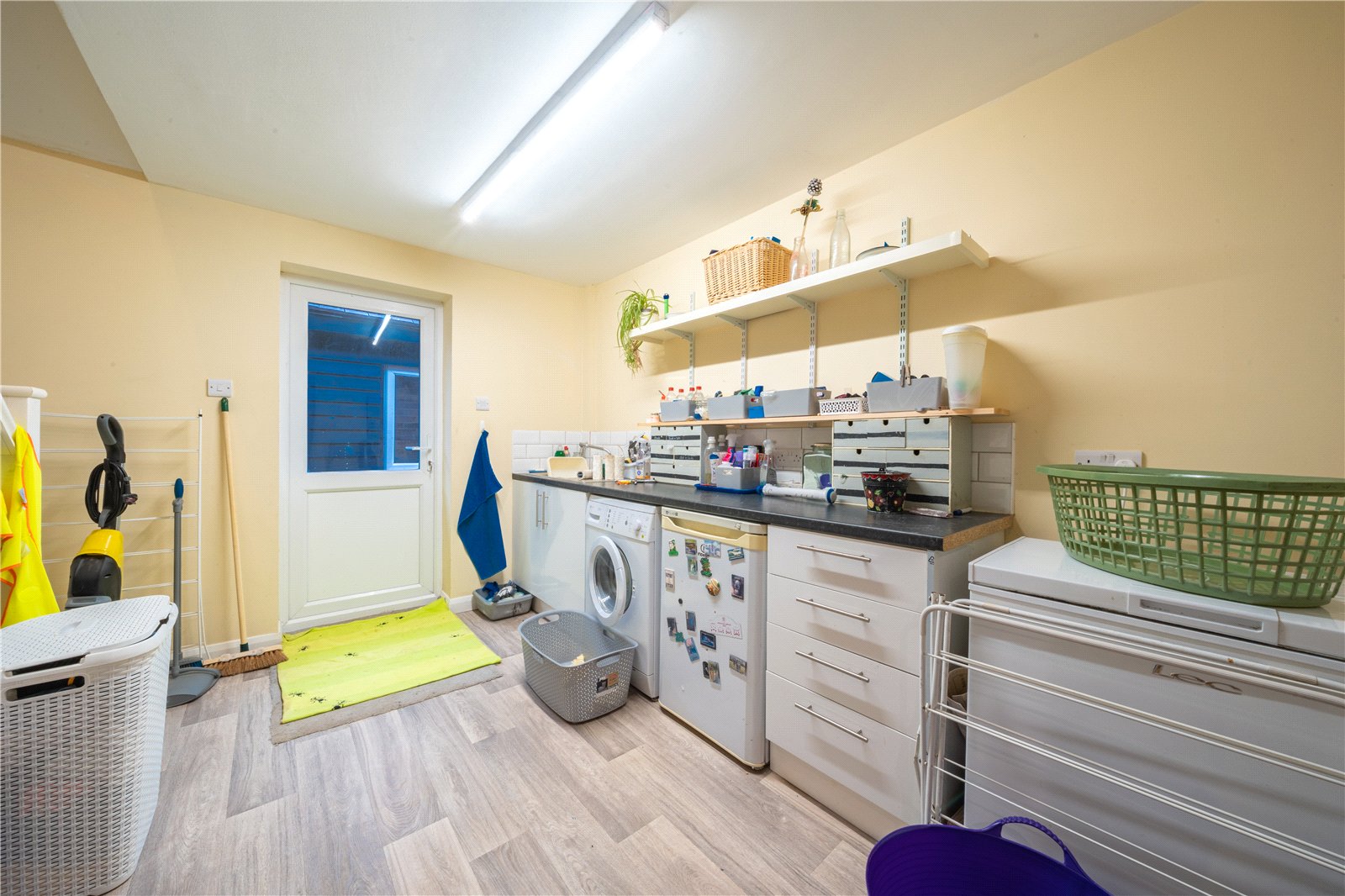 UTILITY ROOM: A practical and well-proportioned utility room providing valuable additional workspace and storage. Fitted with a range of base units, work surfaces and open shelving, the room accommodates appliances including a washing machine and additional white goods. A door provides direct external access, enhancing everyday practicality, while ceiling lighting and durable flooring complete this functional space, ideal for laundry, storage and general household use.