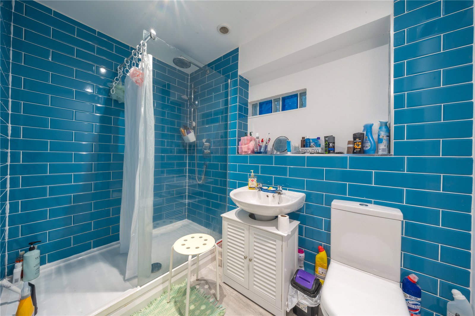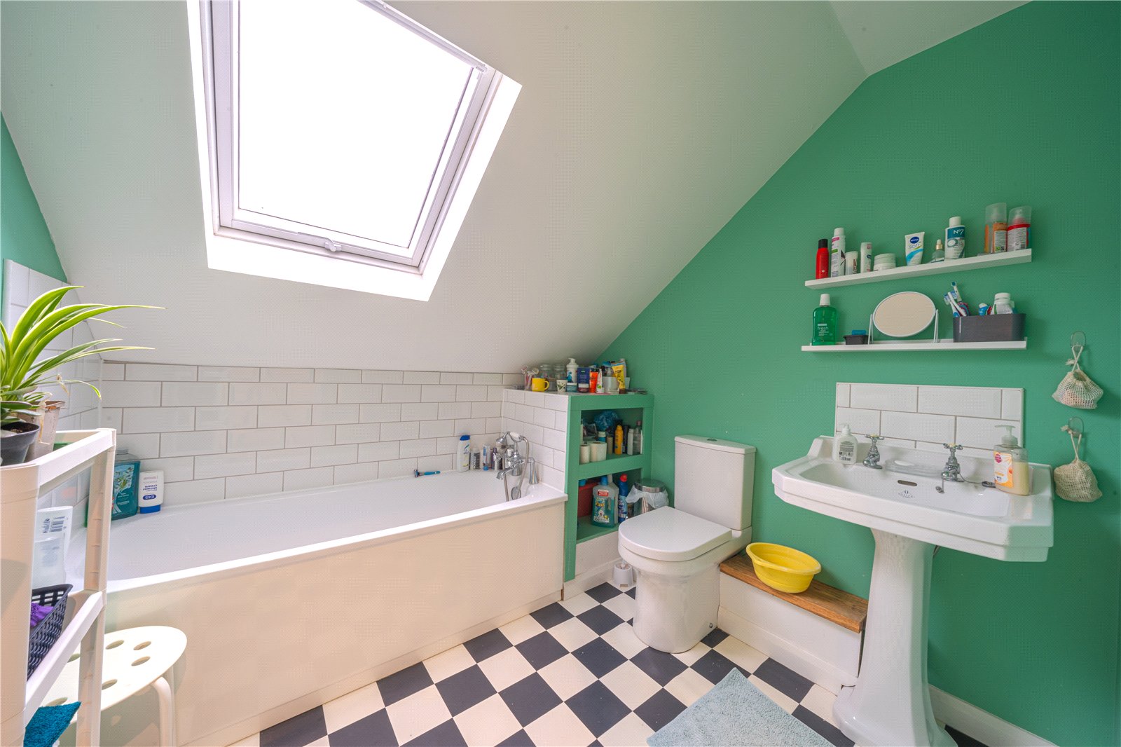 FAMILY BATHROOM: A bright and characterful family bathroom positioned on the upper floor, featuring a sloping ceiling with a rooflight that floods the room with natural light. The suite comprises a panelled bath with shower attachment, pedestal wash hand basin and low-level WC. The room is finished with white subway tiling to splashback areas, a distinctive tiled floor, and open shelving providing practical storage. The combination of bold wall colouring and excellent natural light creates a fresh, airy feel, making this a well-proportioned and functional family bathroom.