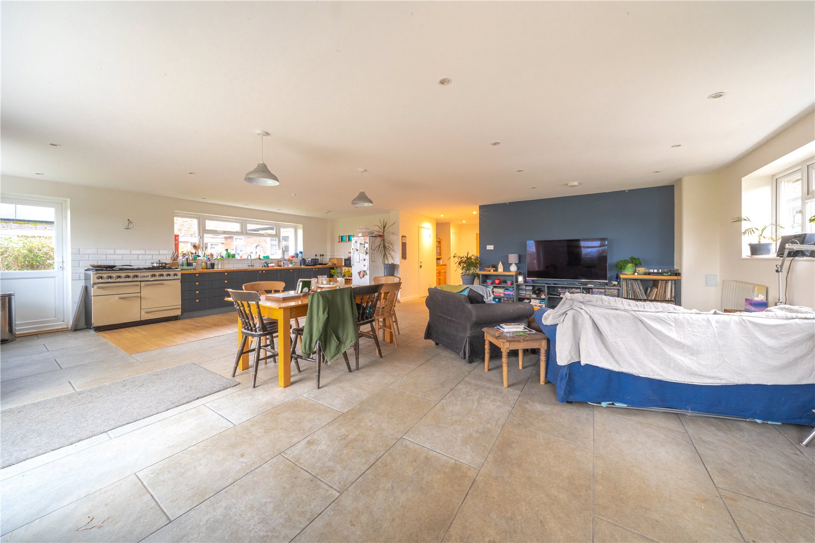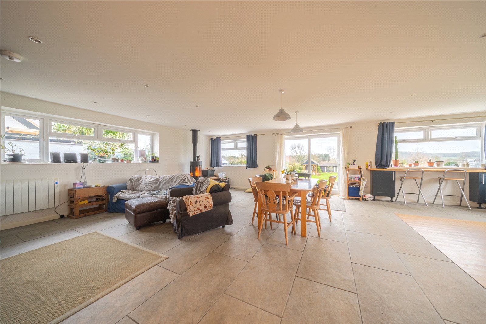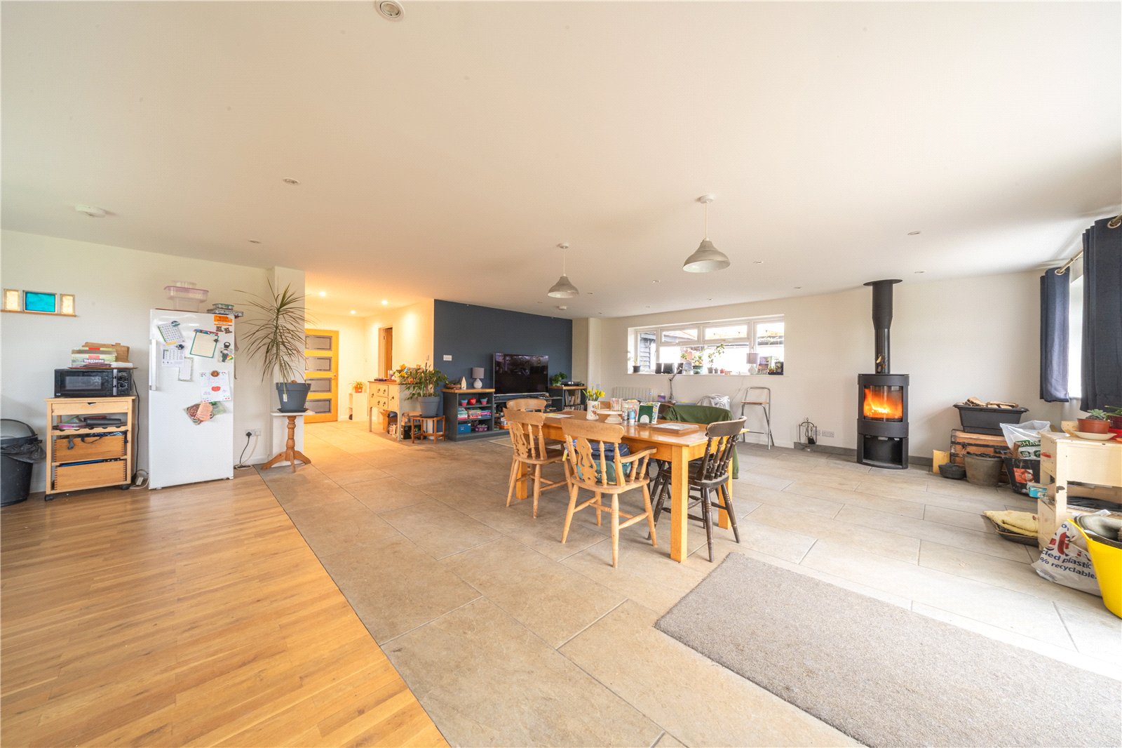 KITCHEN/DINING/FAMILY ROOM: An impressive and generously proportioned open-plan kitchen, dining and family room forming the heart of the home and perfectly suited to modern family living and entertaining. The kitchen area is fitted with an extensive range of base units with solid work surfaces, a range-style cooker and ample space for freestanding appliances, complemented by excellent natural light from multiple windows. The dining area comfortably accommodates a large table for family meals and gatherings, while the family seating area is centred around a contemporary wood-burning stove, creating a warm and inviting focal point. Finished with a combination of tiled and wood flooring, recessed and pendant lighting, and full-height glazed doors opening onto the garden, the space offers outstanding versatility, light and flow, seamlessly connecting indoor and outdoor living.