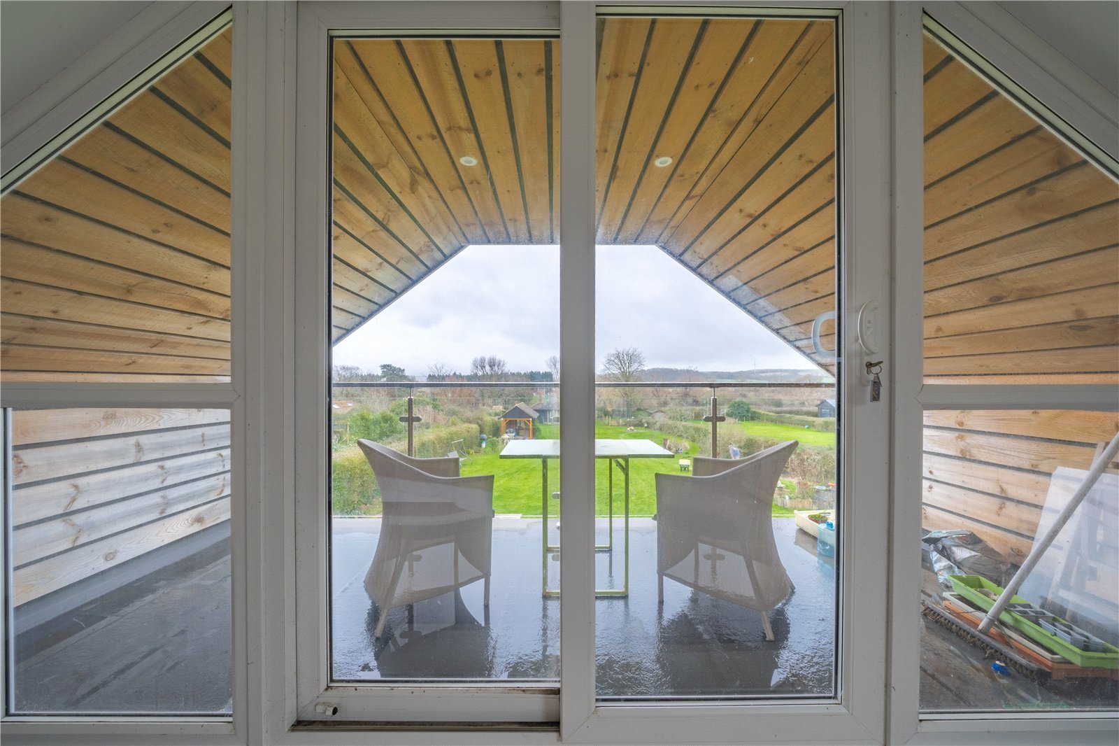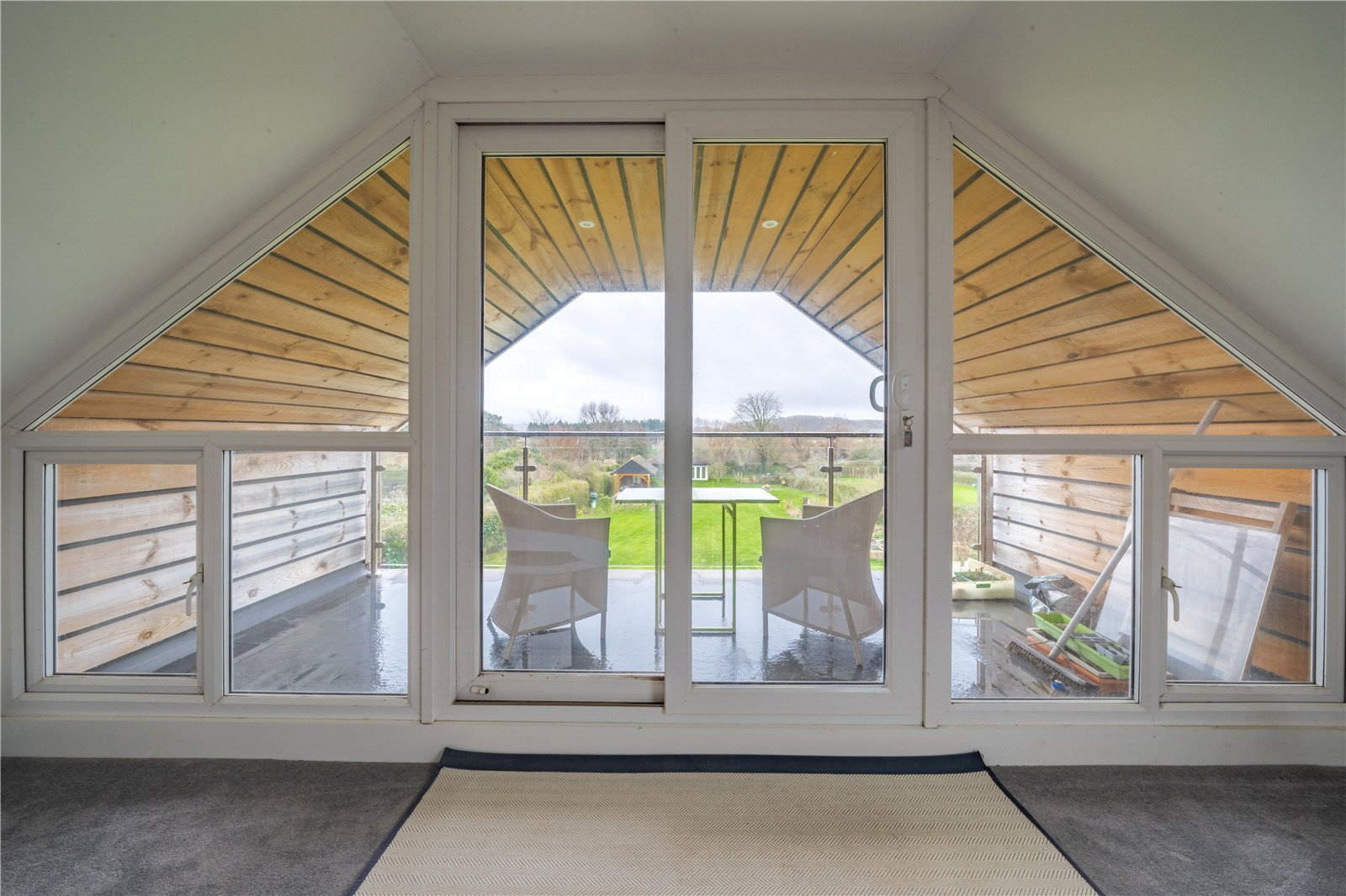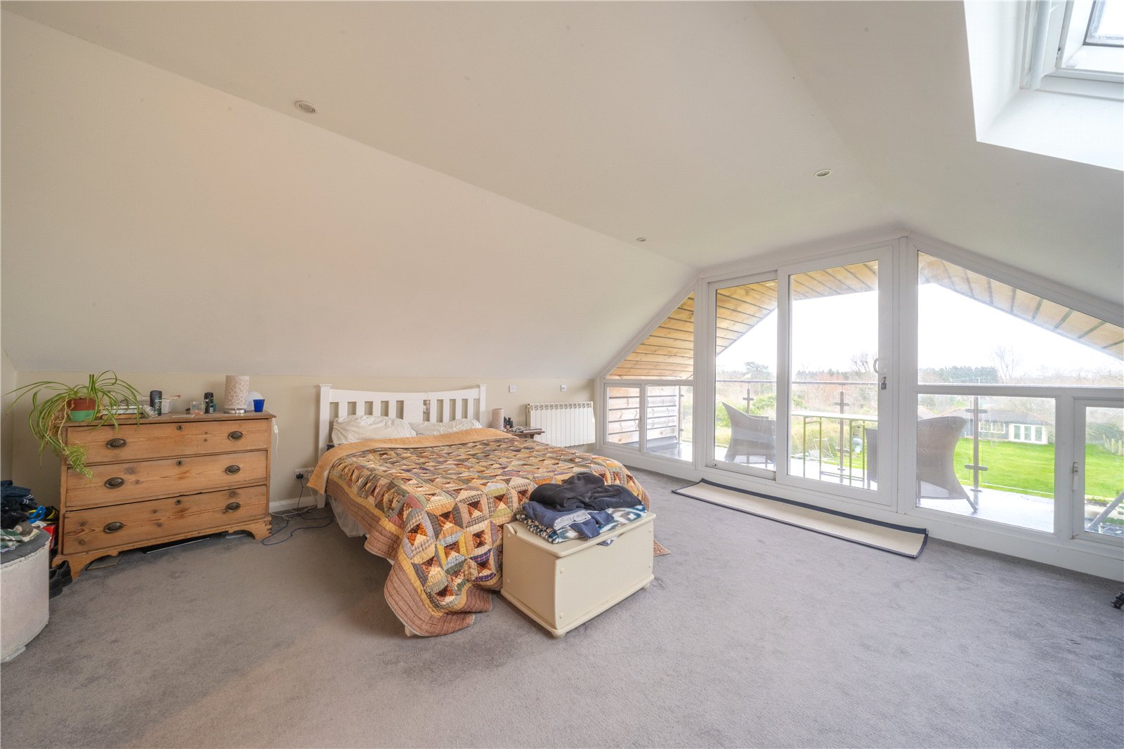 BEDROOM 1: An exceptional and generously proportioned principal bedroom occupying an elevated position within the house, featuring striking vaulted ceilings and an abundance of natural light. The room offers excellent floor space for a large bed and additional furniture and is finished with soft carpeting and recessed ceiling lighting throughout. A rooflight enhances the sense of height and light, while full-height glazed doors and side windows open onto a private balcony, providing far-reaching views over the garden and surrounding countryside. The combination of architectural interest, scale and outlook creates a calm and luxurious retreat, ideal as a principal bedroom.