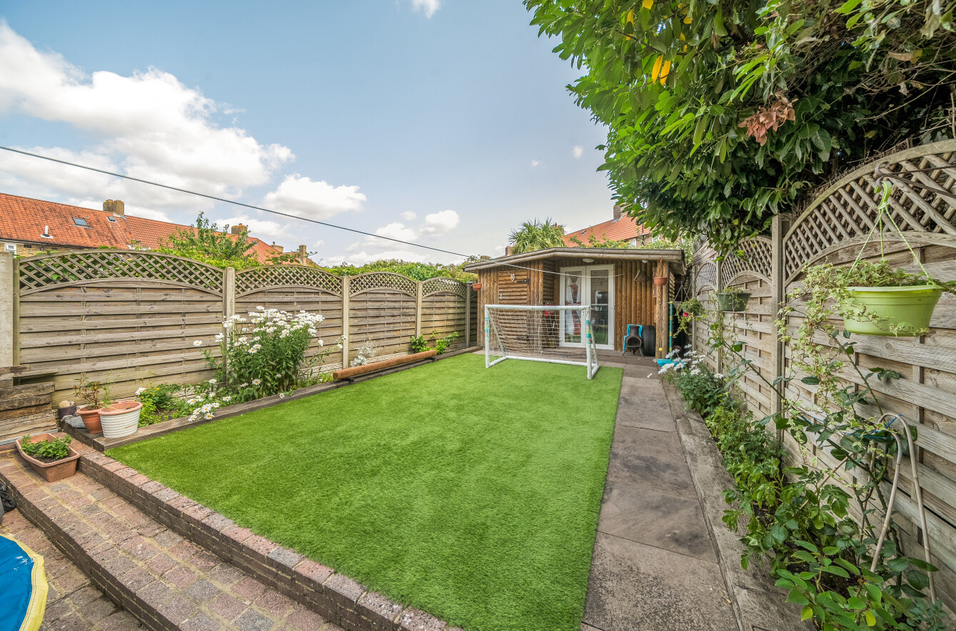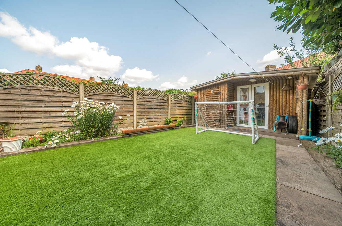 The property features a modern kitchen fitted with sleek gloss wall and base units, offering ample storage and worktop space. The bright and welcoming reception area opens out to a well-kept rear garden that includes a patio, a lawned area, and a versatile summer house—perfect for storage, hobbies, or a garden office.