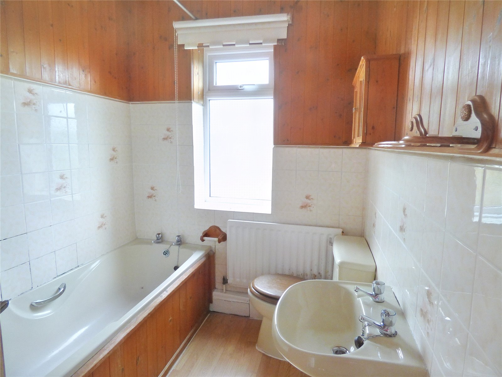 Bathroom 5'11" x 7'8" (1.8m x 2.34m). Vinyl flooring. Partially tiled walls. Radiator. Bath. Wash basin. WC. Frosted window to rear.