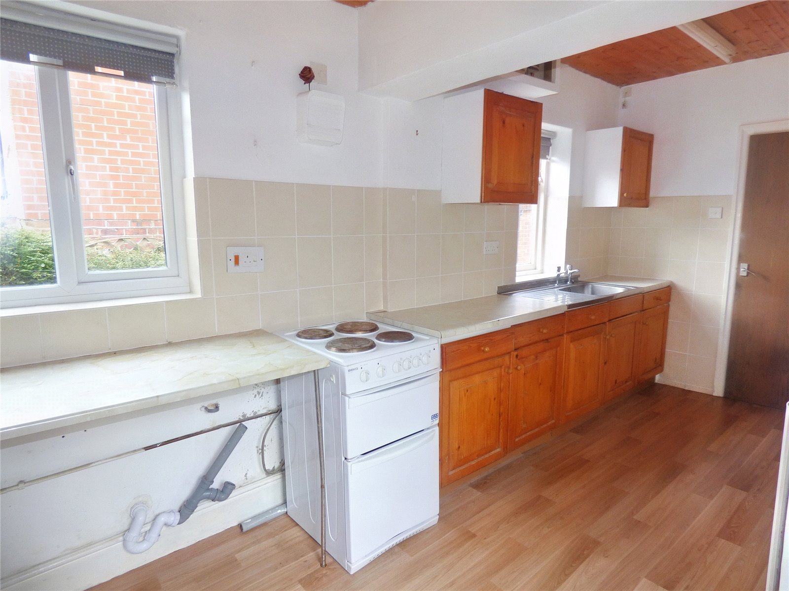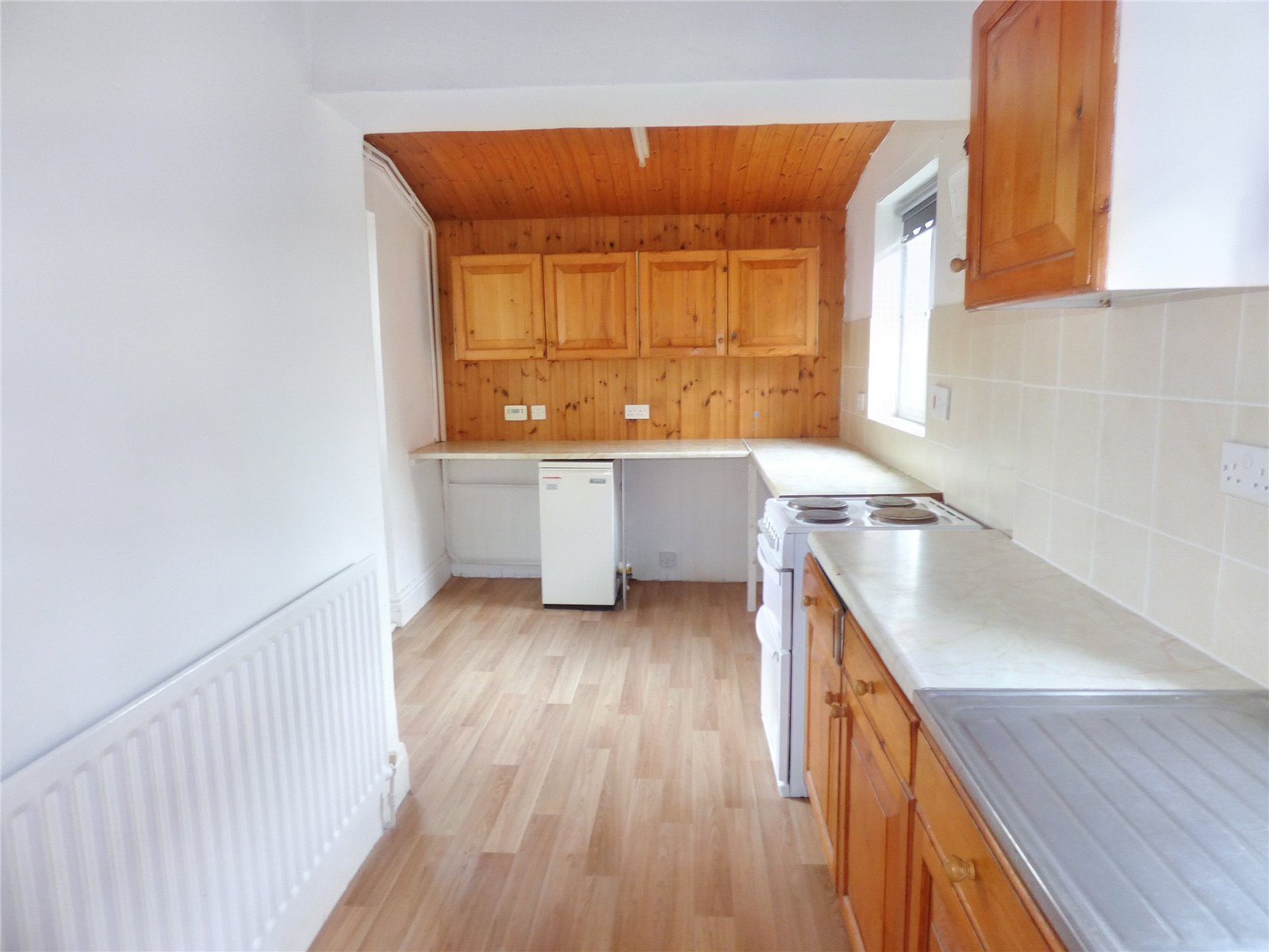 Kitchen 8'1" x 17'1" (2.46m x 5.2m). Vinyl flooring. Partially tiled walls. Range of wooden wall and base units. Stainless steel sink and drainer. Plumbing for washing machine. Space for electric cooker. 2 windows to side. UPVC door to garden.