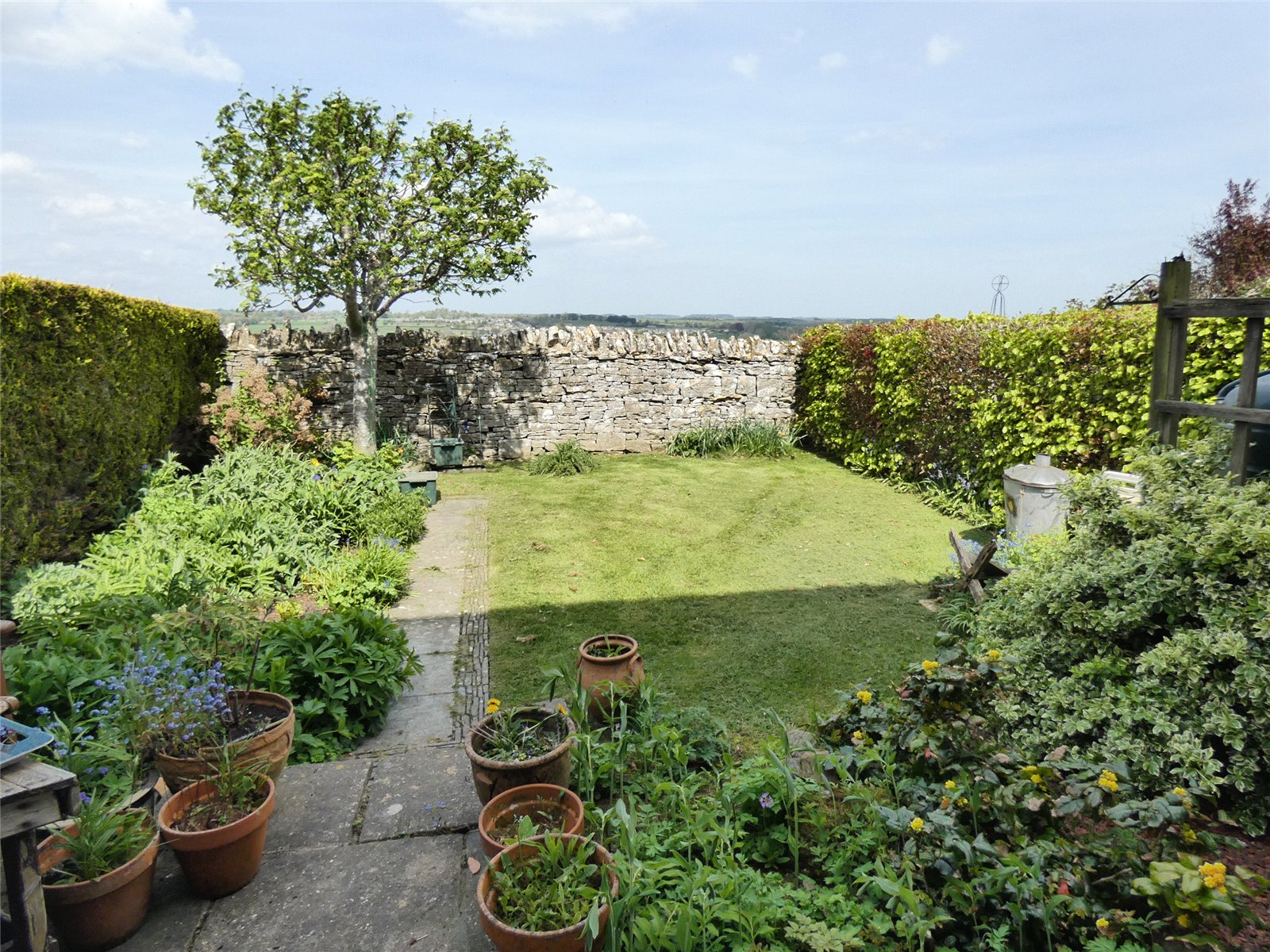 Rear Garden Enclosed lawned garden. Stone flag patio area. Oil tank. Views.