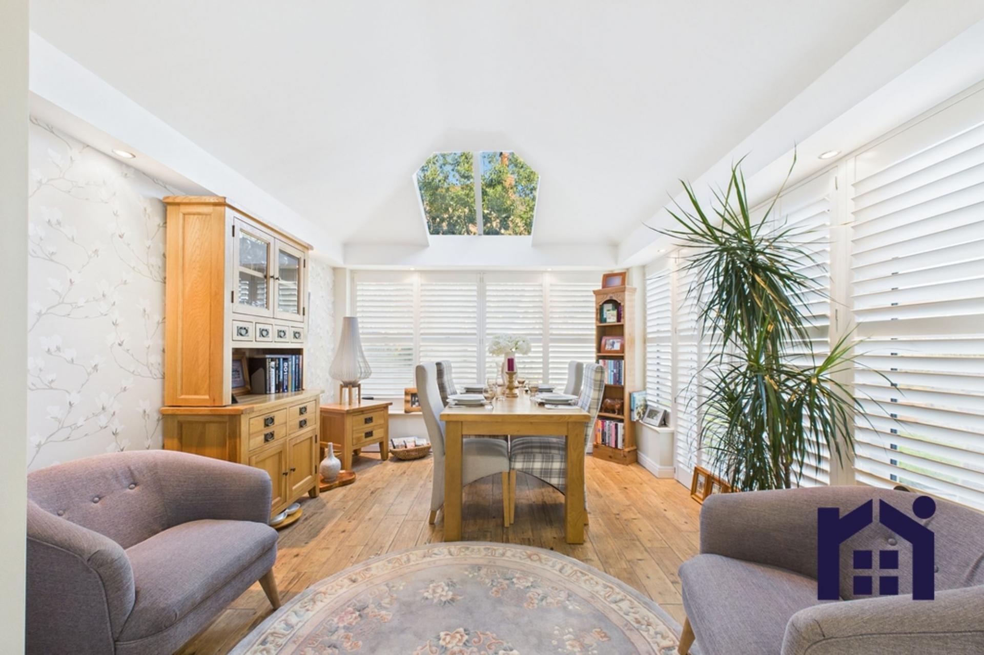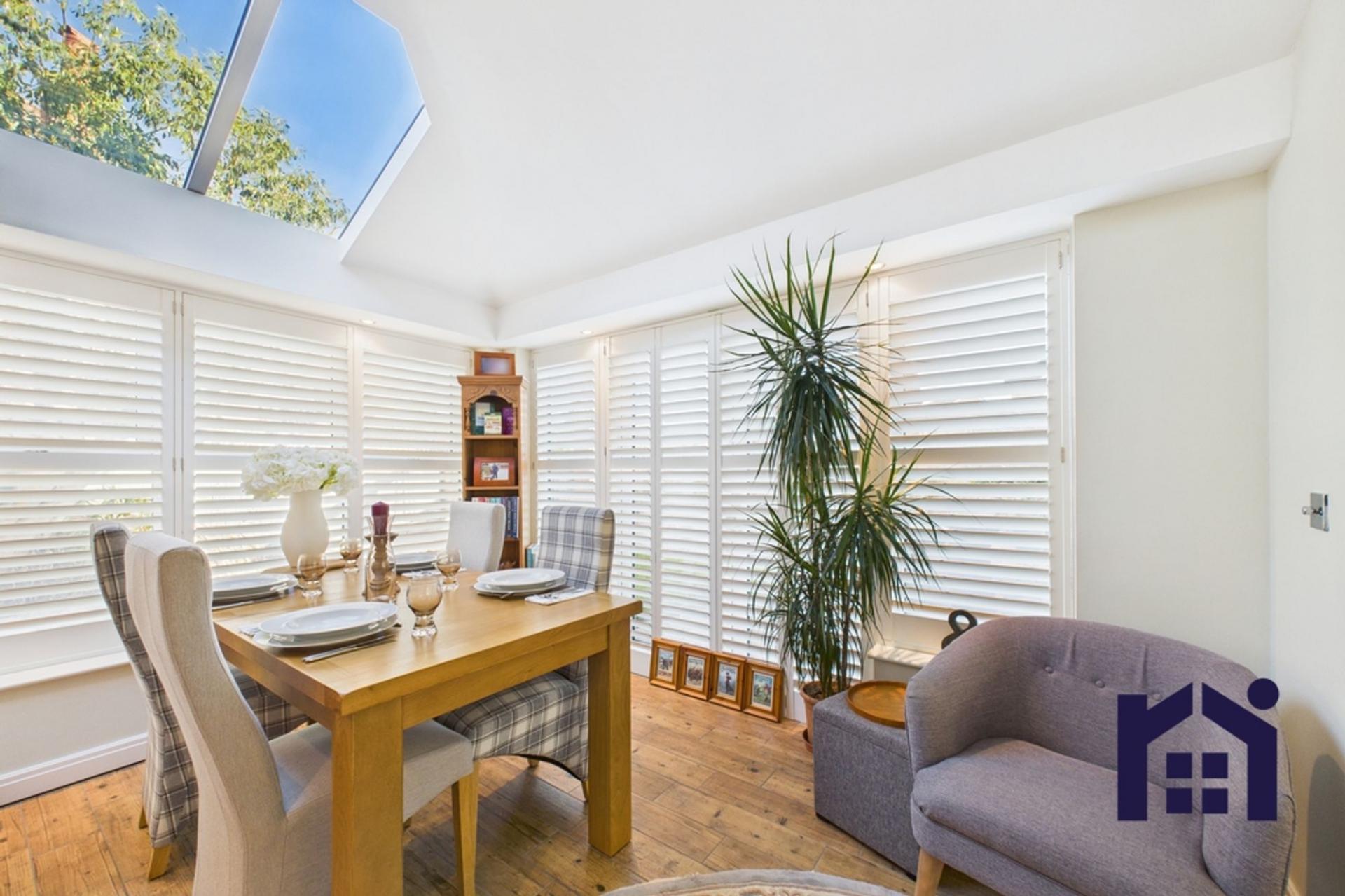 Step into the welcoming hallway with cloakroom off, comprising wc and wash hand basin. To the left, the living room benefits from a remote controlled gas fire set within a travertine hearth and flows effortlessly through to the gorgeous orangery, currently enjoying life as a dining room with elegant shutters and patio doors opening to the garden.