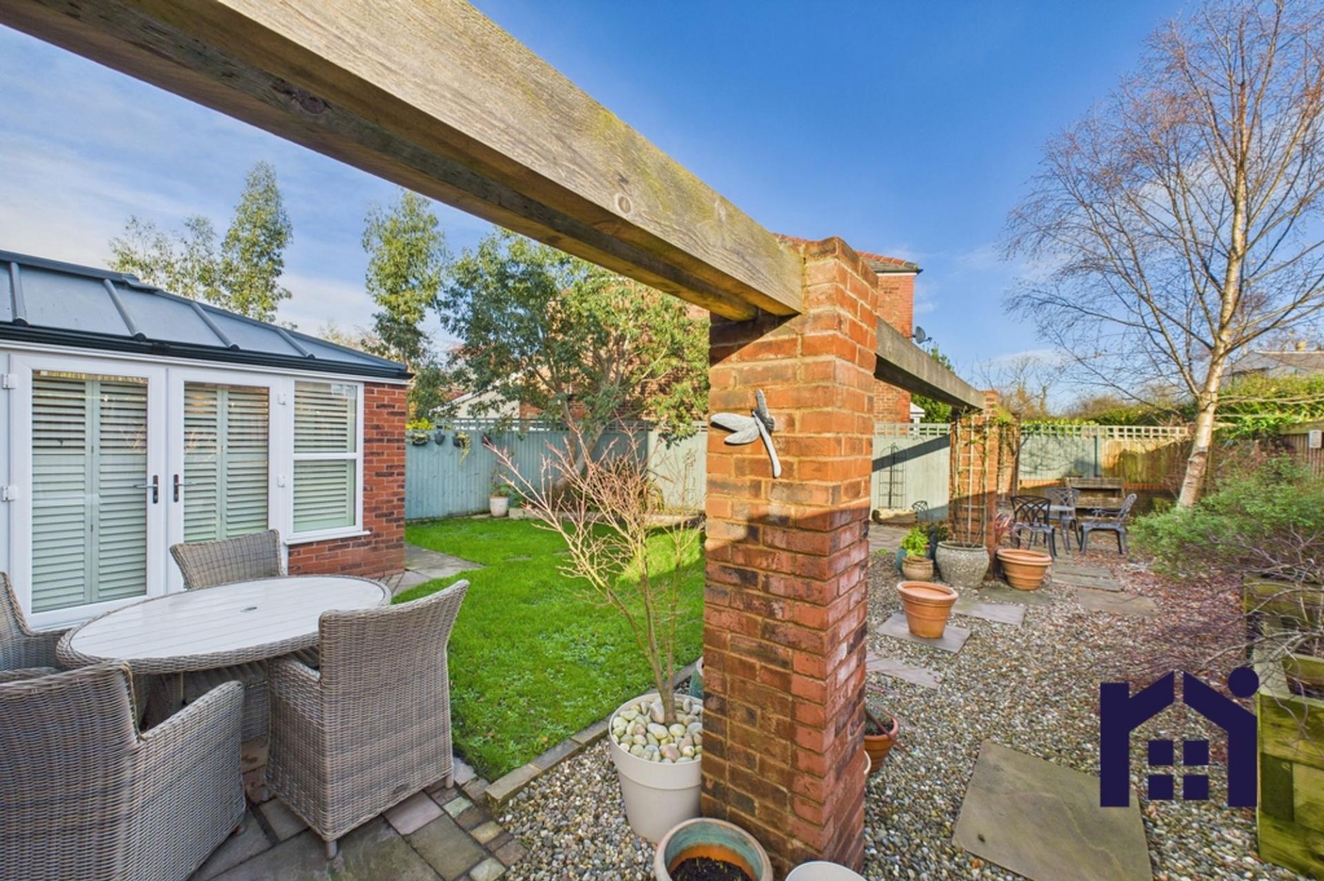 Step outside into the private rear garden with lawn, Indian stone lower terrace, and brick pillar pergola guiding you down past planted raised beds to the upper terrace—the perfect place in which to relax and entertain at the end of the day.